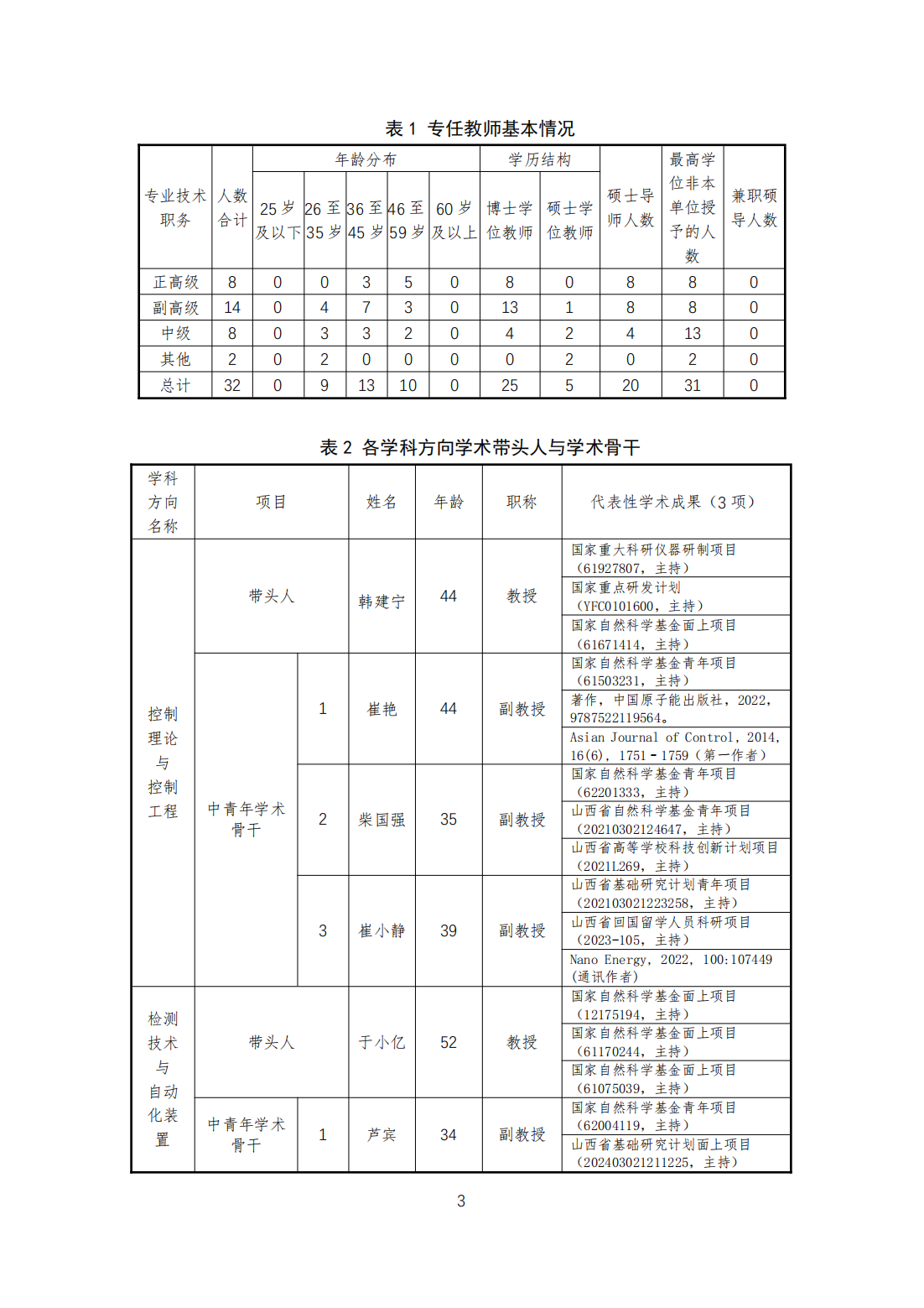 本学科团队队伍结构合理,整体素质较高,综合实力较强,本学科现有固定人员32人,其中教授8人,副教授14人;具有博士学位25人,具有海外经历教师7人;山西省首批“三晋英才”2名;硕士生导师20人。专任教师队伍知识结构、技术职务结构、学历结构以及年龄结构合理,形成了以学术带头人为主、优秀中青年教师为骨干的教师梯队,充满发展活力与潜力。
