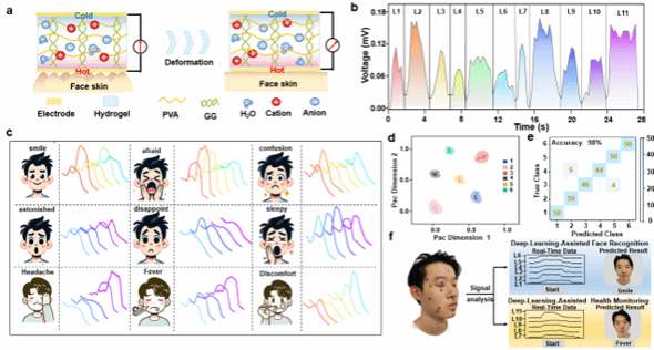 该研究首先基于聚乙烯醇(PVA)、结冷胶、甘油等制备了具有热电转换特性的双网络热电水凝胶(PGG)传感贴片,其各组分之间的氢键相互作用赋予凝胶优异拉伸性和抗干燥性,同时,氧化还原对[Fe(CN)6]4-/3-和其他电解质的加入,温度场诱导的热伏效应与索雷特效应协同作用赋予PGG良好的热电转换能力,热电势可达1.89 mV K-1。其次,鉴于该热电水凝胶可与人体皮肤共形贴合,我们选择了面部11个关键肌肉位点作为监测点,实现对面部肌肉活动和温度变化的自驱动感知。最后,通过机器学习算法深入解析不同面部表情所对应的信号特征,实现了面部表情精准识别和人体健康状态监测。该成果在人机交互、健康管理和智能穿戴等领域都具有重要的应用潜力。