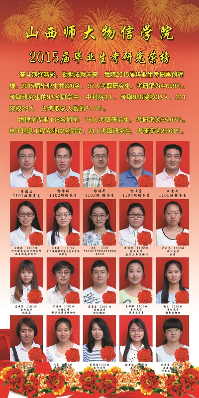 奋斗演绎精彩,勤勉成就未来,公司2015届毕业生考研再创辉煌。2015届毕业生共220名,97人考取研究生,考研率为44.09%。考取研究生的97名同学中:中科院3人、考取985院校37人、211院校29人,占考取总人数的71.1%。