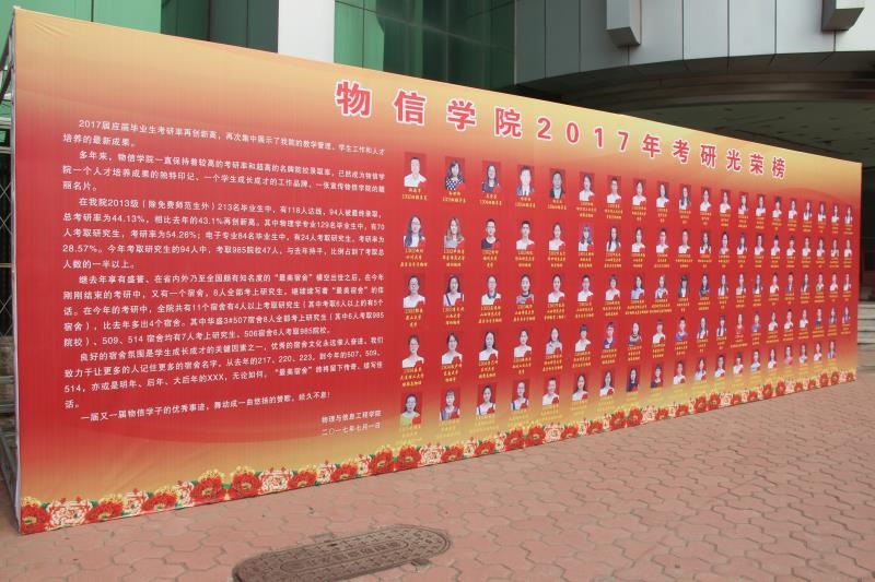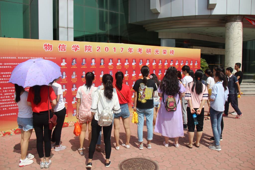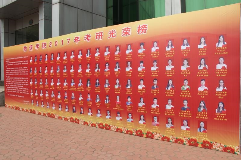 在每年的夏季,学院多少学子披挂上阵,如利刃之新发。他们以笔为矛,续写物信更加辉煌的成绩;一路朝歌,唱响物信又一次的凯旋。丰硕的战果再次赢得所有人瞩目,公司2013级(除免费师范生外)213名毕业生中,有118人达线,94人被最终录取,总考研率为44.13%,相比去年的43.1%再创新高。其中物理学专业129名毕业生中,有70人考取研究生,考研率为54.26%;电子专业84名毕业生中,有24人考取研究生,考研率为28.57%。今年考取研究生的94人中,考取985院校47人,与去年持平,比例占到了考取总人数的一半以上。