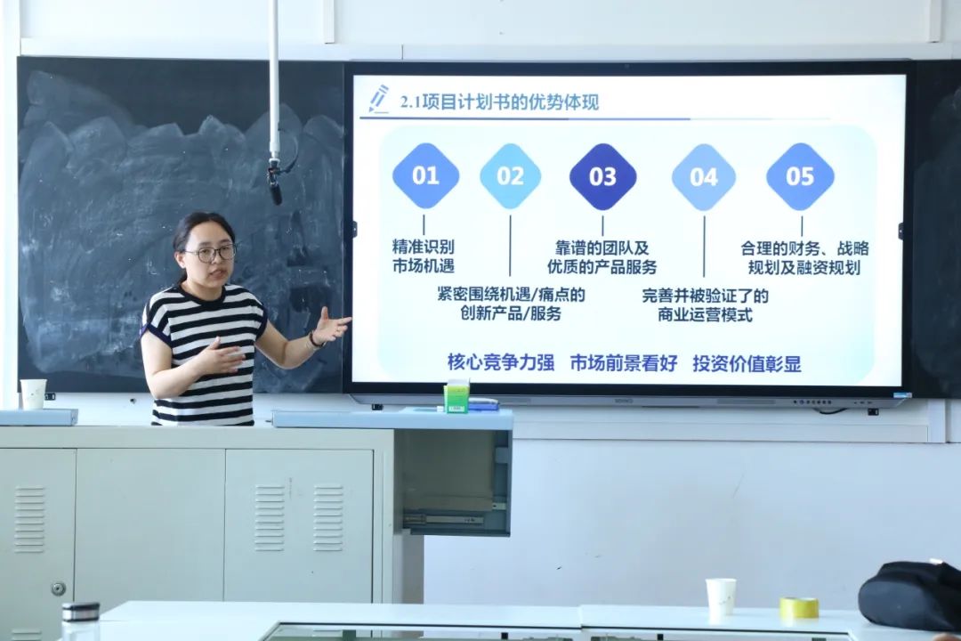 会上,各项目团队从项目背景、项目内容、市场分析、商业模式等方面作了详细的项目介绍。随后,李硕老师认真查看了各项目的商业计划书,并结合PPT为同学们详细讲解了如何撰写一份高质量的商业计划书。她强调,一份优秀的计划书不仅要清晰明了地阐述项目的目标、内容、市场定位等基本信息,还要突出项目的创新点、可行性和商业价值。李老师结合多个实际案例,深入浅出地分析了计划书的撰写技巧,让同学们受益匪浅。