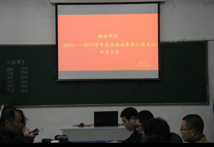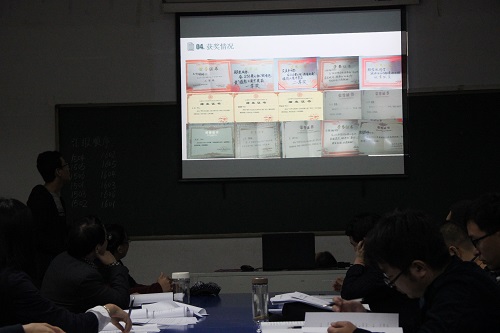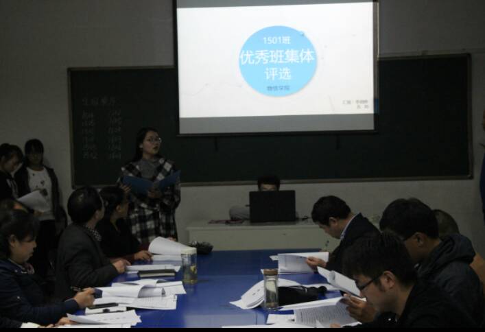 陈向波书记首先介绍了先进班集体评选办法,院学工组日常考核占40%,员工代表和老师现场投票各占30%。接着,大二大三各班按照抽签顺序采用PPT的形式进行了汇报展示,内容基本包括班级建设,学风建设,文化建设,活动实践,总结展望等几个方面,汇报形式多样,极富特色。