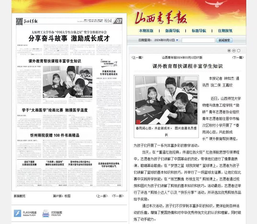 《山西青年报》报道我院“励耕”青协“春雨润心田,共赴新成长”教育帮扶实践活动