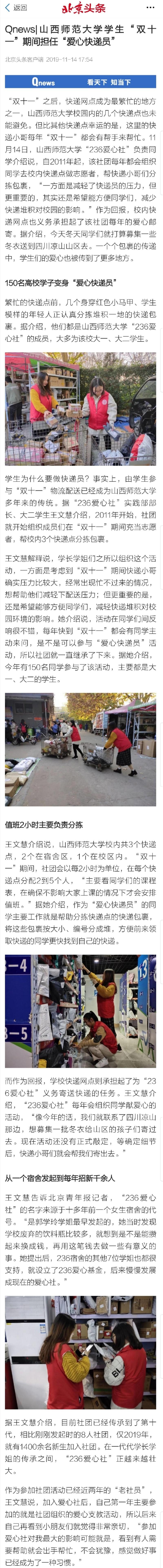 北京头条客户端报道了236爱心社双十一爱心速递员活动