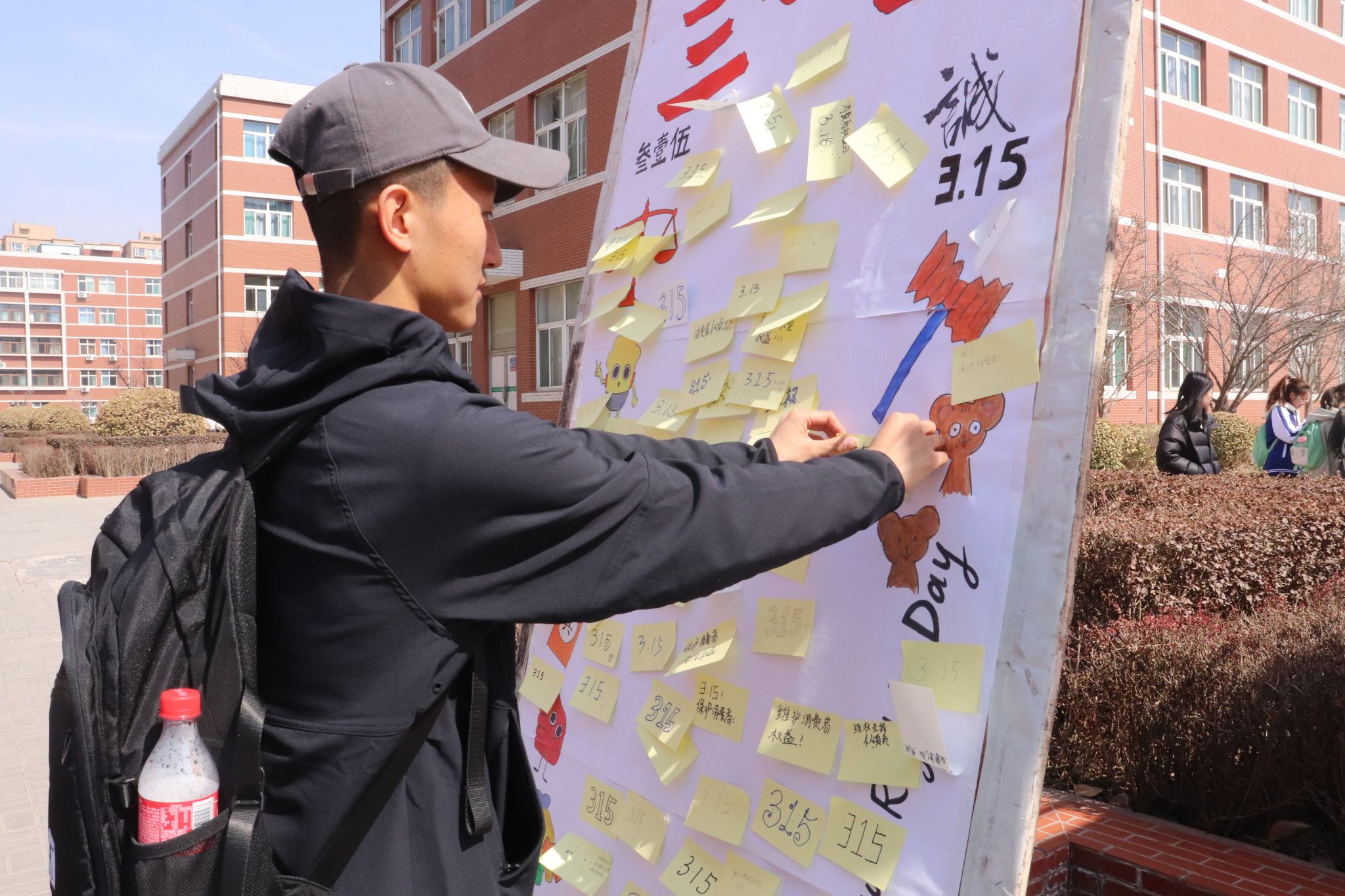 为迎接3·15 国际消费者权益日的到来,院自律部联合院新媒体美工组于3月15日在四五号教学楼之间开展“人生青春无价,消费维权有约”3·15国际消费者权益日宣传活动。