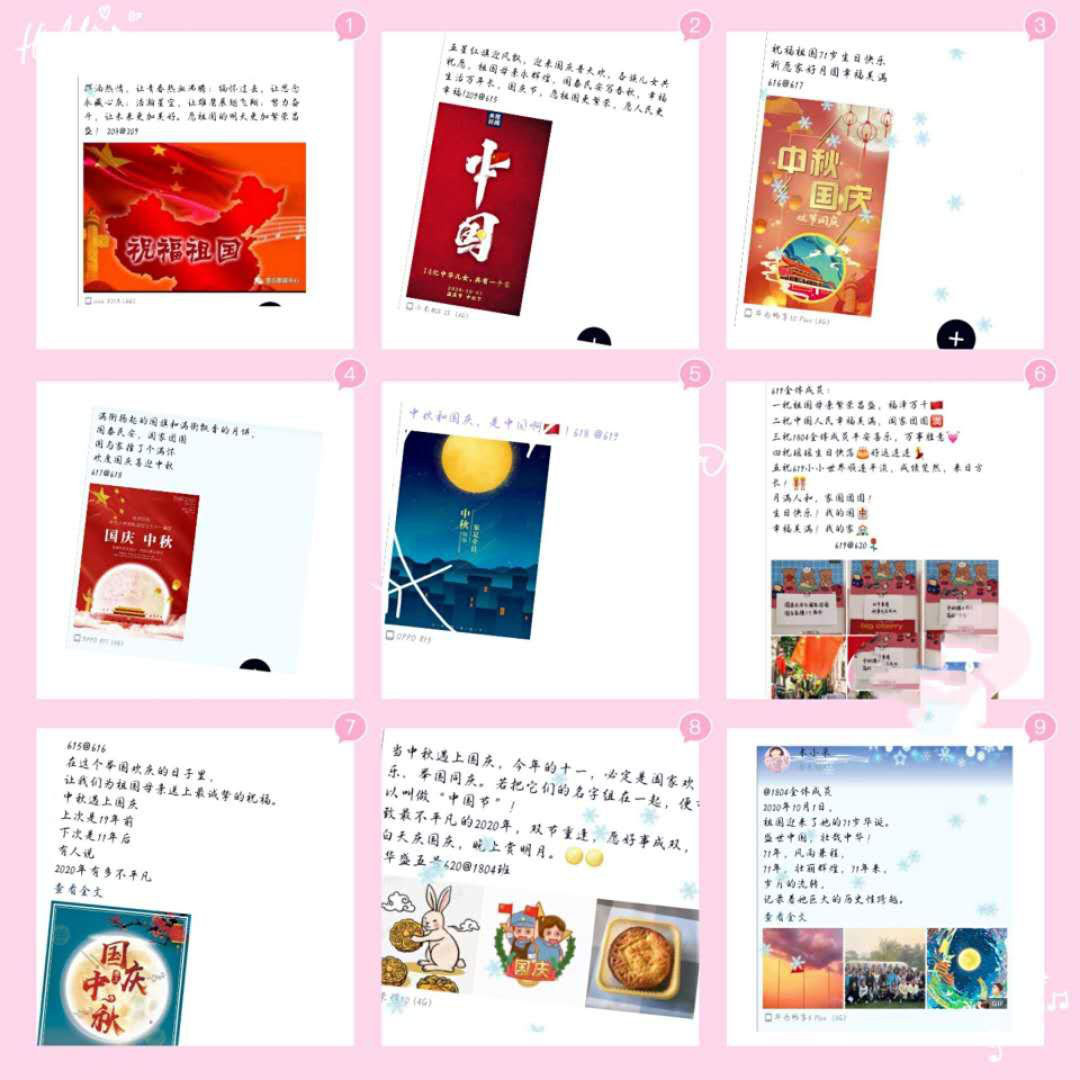 本次团日活动主要包括三个内容:“我为祖国献祝福”活动中,同学们在QQ动态里采用接龙的方式传递了对于祖国的祝福;“中秋故事会”活动中,同学们一起赏月,品月饼,分享中秋小故事;“中秋祝福千里传”活动中,同学们以电话或信息的方式向亲人朋友传递中秋祝福。