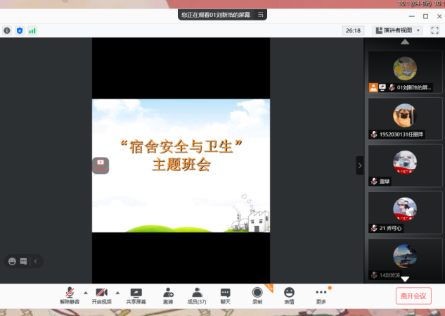 为了营造良好的宿舍环境,帮助同学们养成良好的卫生习惯,提高同学们的安全意识,12月12日,公司1905班开展了“宿舍安全与卫生”线上主题班会。本次班会由班长刘新浩主持。