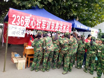 炎炎夏日送清凉 ,滴滴关怀暖人心。直至9月,我市仍然持续高温天气。为确保在高温天气下军训的大一新生身体健康,236爱心社开展送清凉活动,在军训期间无偿为同学们送饮水,献爱心,给学弟学妹们带去丝丝关怀。