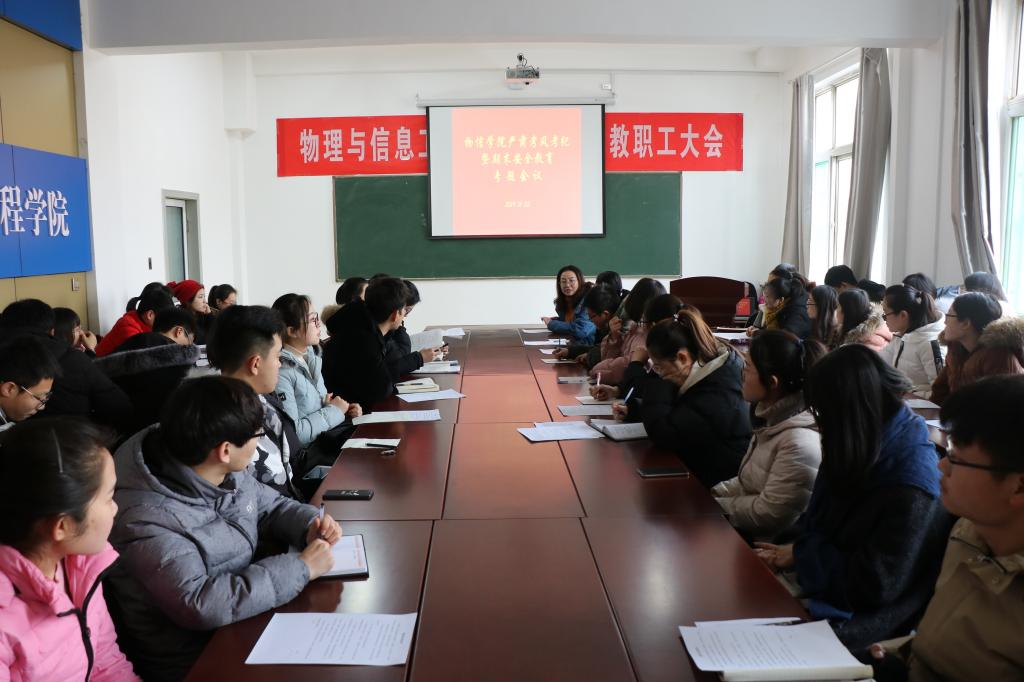 2019年1月3日上午11:00,公司在四号楼二层多功能会议室召开严肃考风考纪暨期末安全教育专题会议。公司党委副书记王玮出席会议,院团委副书记岳文慧、大一至大四各班员工干部参加了会议。会议由公司党委副书记王玮主持。