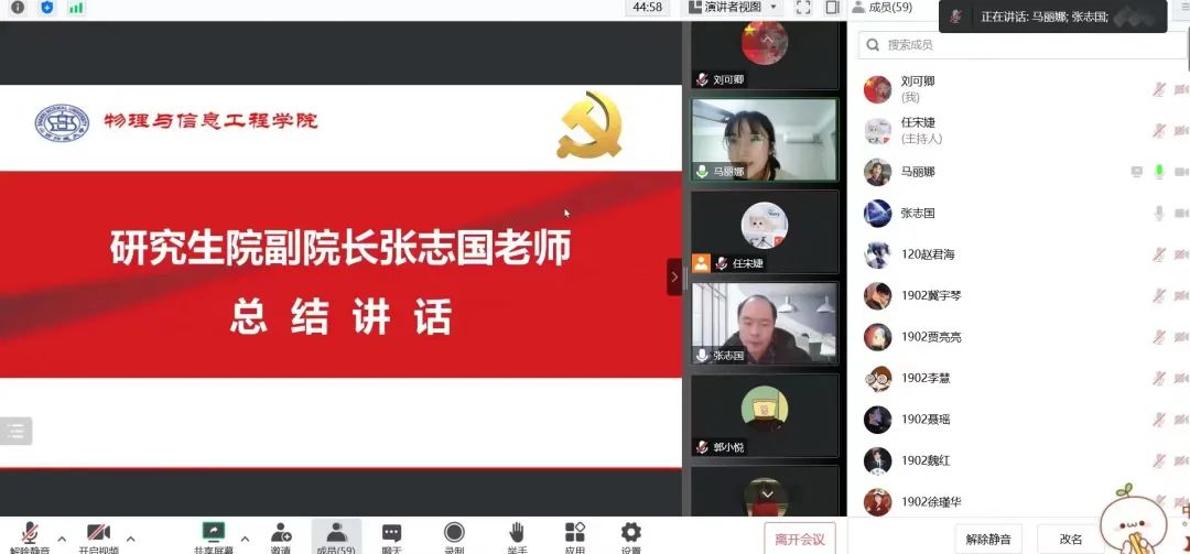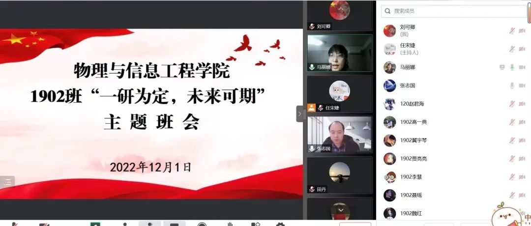 为了鼓励同学们在考研路上坚定信心,全力冲刺,12月1日,公司1902班于线上开展了“一研为定,未来可期”主题班会活动。研究生院副经理张志国老师出席了此次班会。班会由辅导员马丽娜主持。