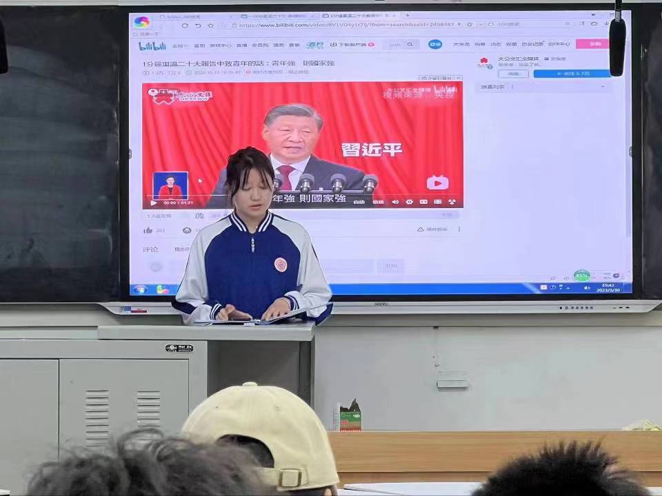 活动中,李婉洁带领同学们重温入团誓词,了解五四青年节的由来和意义,带领同学们深入学习五四精神。她还向同学们介绍了五四精神的内涵以及五四运动背景下爱国青年的先进事例,进一步激发了同学们的责任感和归属感,产生强烈共鸣。交流讨论环节,同学们就“如何向优秀青年学习”发表了自己的观点,表示通过参加此次活动,深刻明白了青年的责任与担当,懂得了要继承和发扬“五四精神”,就要勇担时代使命,奉献国家、奉献人民。