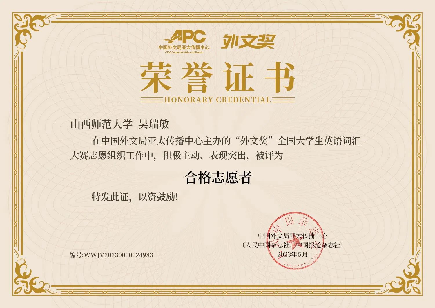 2023.05 “外文奖”全国老员工英语词汇大赛合格志愿者