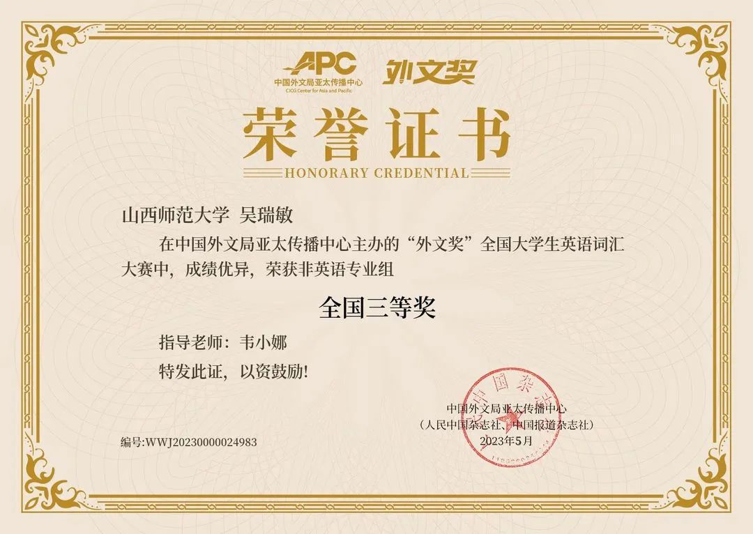2023.05“外文奖”全国老员工英语词汇大赛全国三等奖