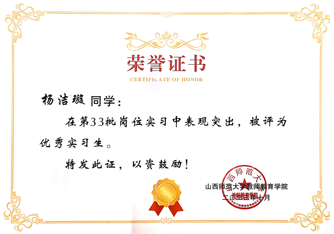 第33批岗位实习中,评为优秀实习生