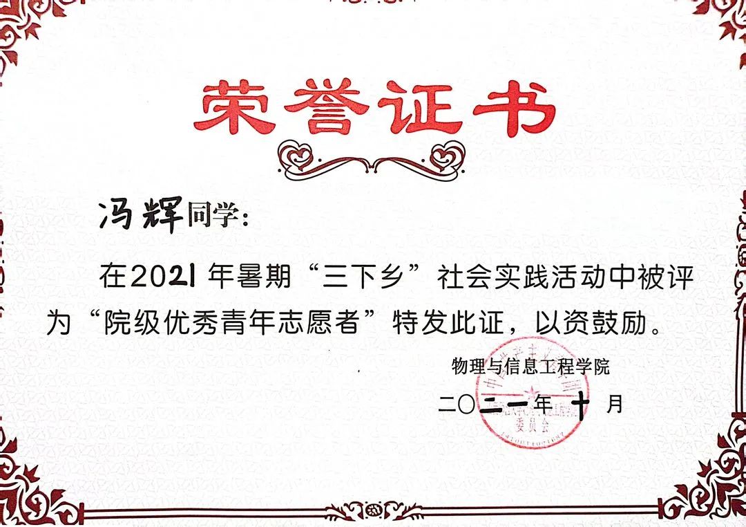 2021.10 在暑期“三下乡”社会实践活动中被评为“院级优秀青年志愿者”