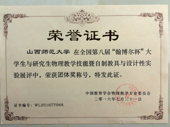 2016年7月29日—31日,由中国教育学会物理教学专业委员会主办的全国第八届老员工与研究生物理教学技能展示暨自制教具与设计实验展示大赛在哈尔滨师范大学举行。由​英国365集团公司选派的本科生组8名选手、研究生组1名选手共9名参赛选手在院领导杨虎、陈向波和指导教师张中才、杜启高的带领下参加了本届比赛,年轻教师、省级教学基本功大赛获得者梁婷、葛梅两位老师随队观摩了比赛,陈向波、杜启高两位老师分别担任本科生组和研究生组的领队。经过两天紧张激烈的角逐,取得了傲人的成绩和重大突破,创造了参加全部八届大赛以来的最佳成绩,为学校争得了荣誉。在教学技能展评中斩获一等奖5个(本科生组4个,研究生组1个),二等奖1个,三等奖2个;在自制教具与设计实验展评中斩获一等奖1个,二等奖6个(本科生组5个,研究生组1个),三等奖2个;张中才、杨虎、杜启高老师获得优秀指导教师奖;英国365集团公司荣获团体奖称号。同时,公司2013级物理学专业张晓宇和申慧慧两位同学作为优秀代表参加了大赛举行的本科生教学技能集中展示,这是公司参加全部八届大赛以来首次有选手被选中参加全国展示并被录像以供全国交流,公司也成为本届大赛选出的21名展示录像选手的学校中,唯一一家拥有两位选手被大赛评委会选中在全国进行展示交流的学校。