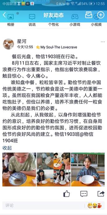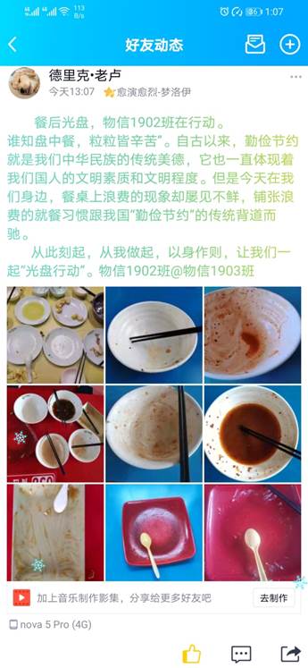 活动由1901班率先发起,并通过QQ空间积极倡导光盘行动,呼吁同学们自觉培养持之以恒的节约习惯,引领勤俭节约的时代新风尚。同学们也积极参与“光盘行动”,纷纷“秀”出了自己的光盘,争做“光盘行动”的实践者。随后,各班级逐一通过@大接龙的方式进一步推广了“节俭养德、全民节约”理念。