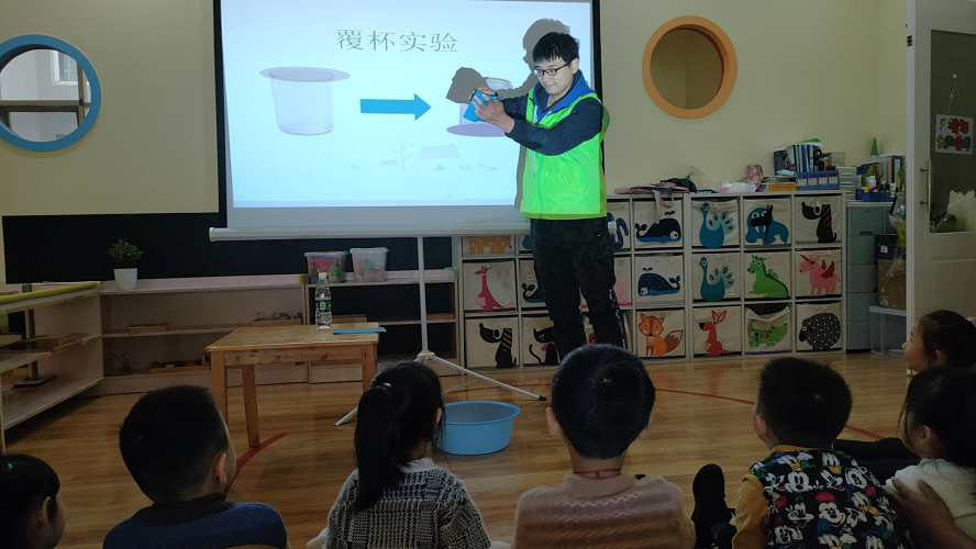 活动伊始,志愿者先为同学们介绍了大气压强的概念,并演示了“覆杯实验”和“人力水泵实验”,让孩子们真切的感受到了大气压的力量,帮助孩子们更好的理解大气压强。在互动环节,志愿者对小朋友们提出的问题进行了细致的解答。为了帮助孩子们更加深刻的理解实验原理,志愿者们和小朋友们一起观看了关于大气压强的动画短片。
