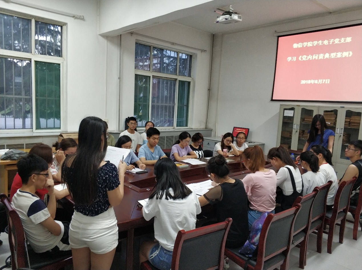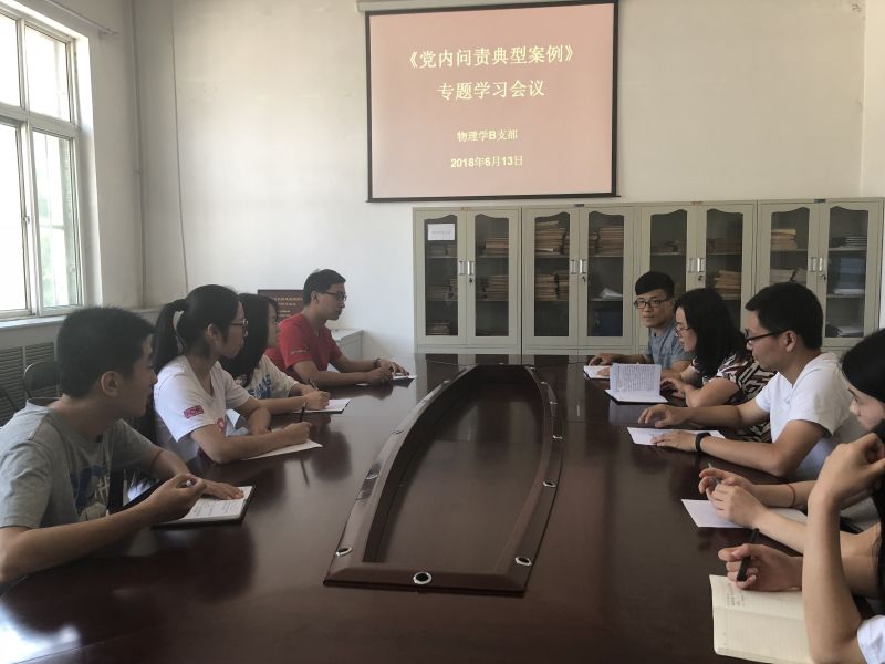6月13日,物理学B支部在四号楼一层会议室召开了《党内问责典型案例》专题学习会议。徐小虎同志首先带领全体党员认真学习了《党内问责典型案例》,结合九起有关问责处理的典型案例,分析问责重点及意义,以供参考。他指出党员干部要深刻汲取教训,切实引以为戒,牢固树立政治意识、责任意识,强化责任担当,认真落实党风廉政建设主体责任,深入推进全面从严治党。无论是日常的批评提醒,还是给予纪律处分,严肃问责都体现着党组织的政治坚定性,检验着把握政策的水平,最终目的是让全体党员受到警示,增强担当精神,肩负起管党治党的责任,自觉把党的路线方针政策贯彻下去,体现出问责条例鲜明的党规特色。随后,其他党员对典型案例进行了讨论,党员同志们一致认为,党的领导是中国特色社会主义最本质的特征,集中体现为政治、思想和组织领导,必须毫不动摇地贯穿到党的各项事业中。全面从严治党的根本目的就是坚持和加强党的领导。有权必有责,失责必追究,问责是全面从严治党的重要抓手。在实践中,每位党员都应该把从严治党的政治承诺转化为具体的制度和行动,这样才能更好地激发全党的历史使命担当,把中国特色社会主义事业不断推向前进。