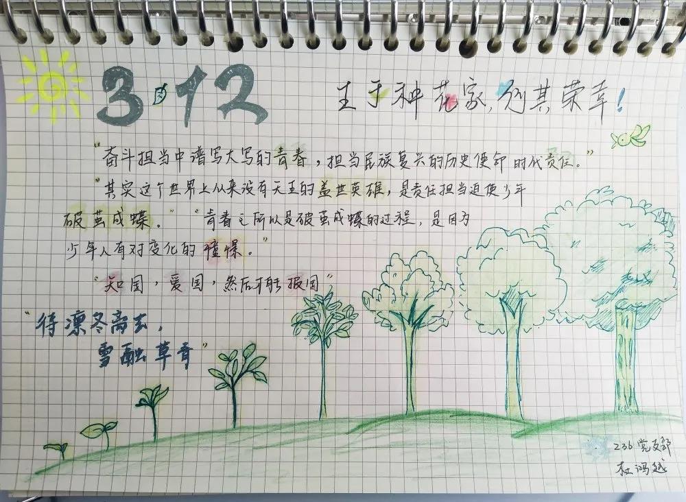 活动中,支部党员以手抄报、手账等形式绘制心中理想之树、希望之树。一幅幅精美的图画寄托着支部党员与中国梦想同心、与国家发展同向的青春理想;彰显着青年学子脚踏实地、求实奋进、勇于担当的十足干劲;传递着宅家师生们合理居家运动,养成健康生活习惯的号召;表达着对人们提升生态环保意识、绿色发展意识、责任使命意识的呼吁。