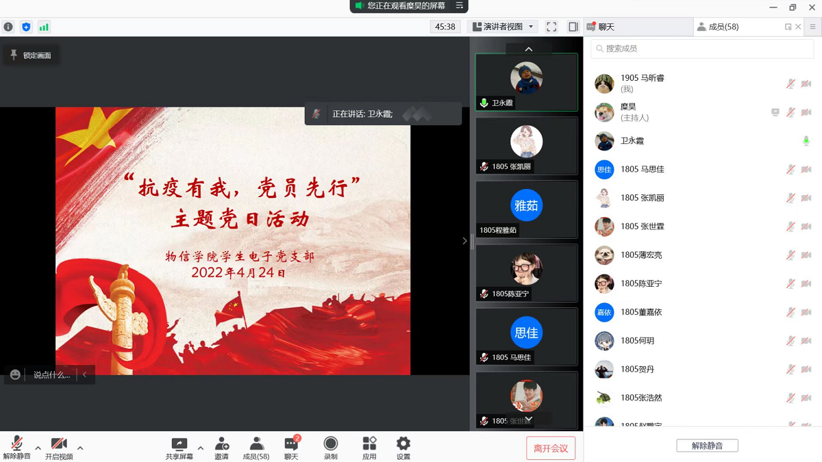 4月24日下午19:00,公司员工电子党支部在线上开展了“抗疫有我,党员先行”主题党日活动。支部全体党员参加了活动,本次活动由支部党员宋文誉主持。