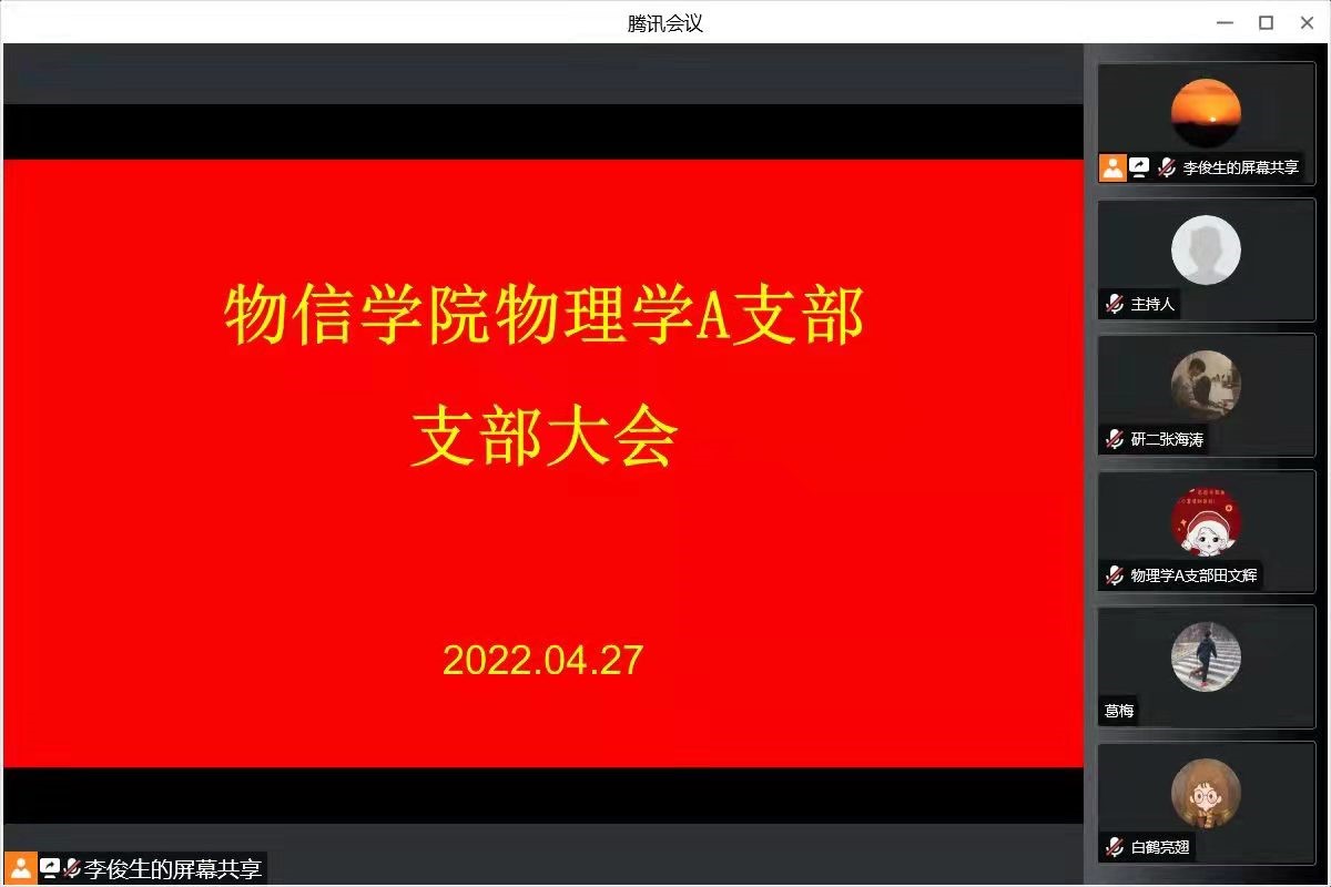 4月27日晚上,公司物理学A支部线上开展了“我践我初心,同心同战疫”主题党日活动。支部全体党员参加活动,活动由支部书记李俊生主持。