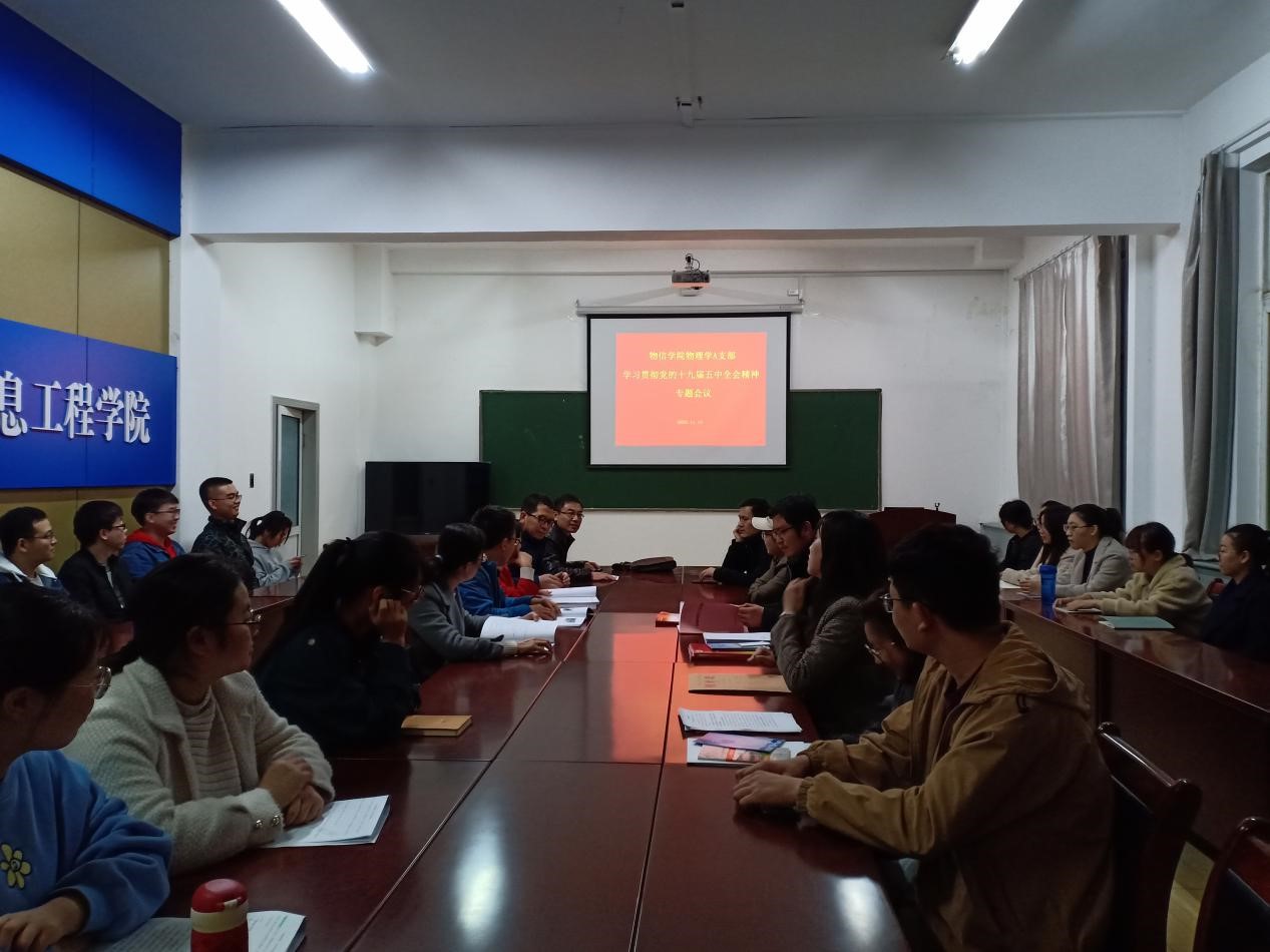 11月13日晚,物理学A支部组织全体党员和入党积极分子在四号楼二层会议室召开学习贯彻党的十九届五中全会精神专题会议,支部书记李俊生主持会议并讲授专题党课。