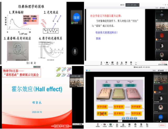 为了更好地发挥党支部对教工党员教学能力和育人功效提升的引领作用,进一步增强教师的立德树人意识,深入挖掘专业课程中所蕴涵的思政育人元素,物理学B支部于6月19日下午利用网络平台开展了教工党员“课程思政”教研展示交流活动。这项活动也是B支部贯彻落实公司党委“一支部一品牌”创建示范活动的主题活动之一。交流会由支部书记程留永主持。