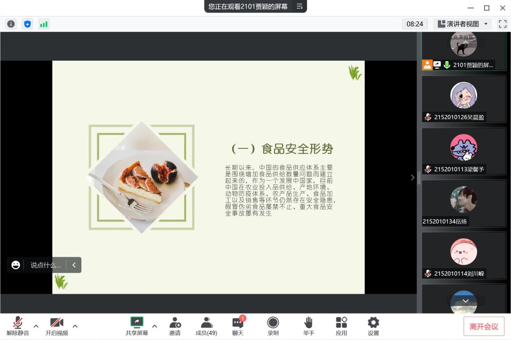 2101团支部带领同学们进行了为期一周的线上光盘打卡活动,同学们都积极打卡,做到了节约粮食从每天、从点滴做起。在活动中团支书还带领同学们学习了一部分《食品安全法》,让同学们对食品安全有了更加详细的了解。