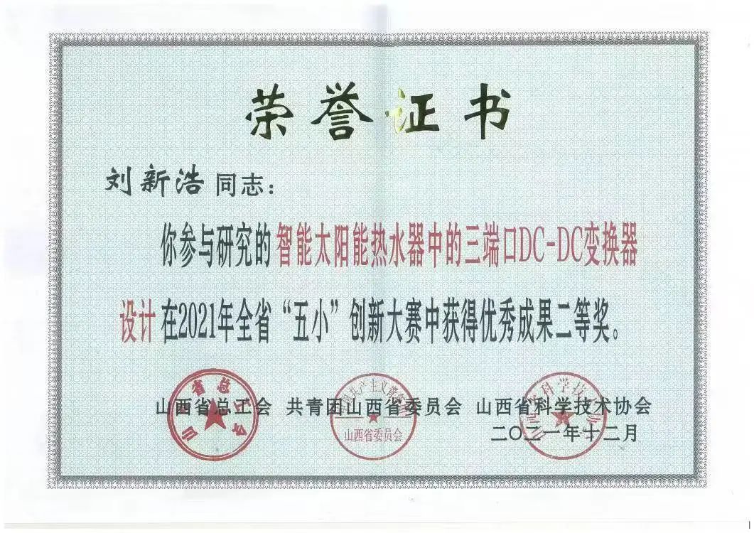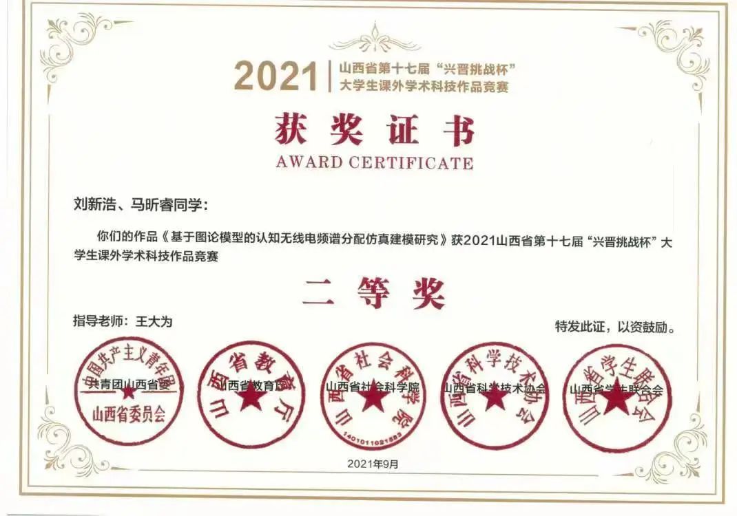 2021年山西省第十七届“兴晋挑战杯”全国老员工课外学术科技作品竞赛(队长) 省二等奖