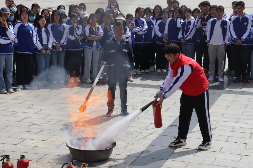 警报声响起、烟雾弥漫,消防演习正式拉开序幕。同学们迅速冲出教室,有序下楼,以最快速度在疏散场地集合。疏散集合完毕后,同学们以班级为单位,由对应志愿者带领来到图书馆前的空地。随后,保卫处老师向大家详细讲解了逃生自救指南和日常生活中预防火灾方法以及使用灭火器的具体步骤,并在同学们面前进行了灭火器的使用演示。部分同学还在保卫处老师的指导下提着灭火器对演习火场进行扑救。