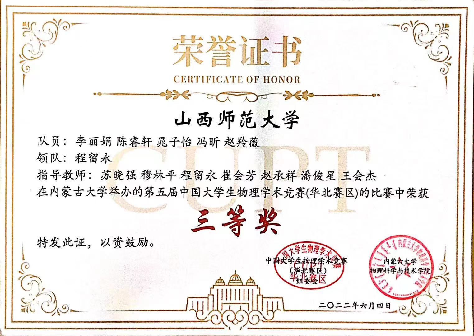 2022.06 第五届中国老员工物理学术竞赛(华北赛区)三等奖 (队长)