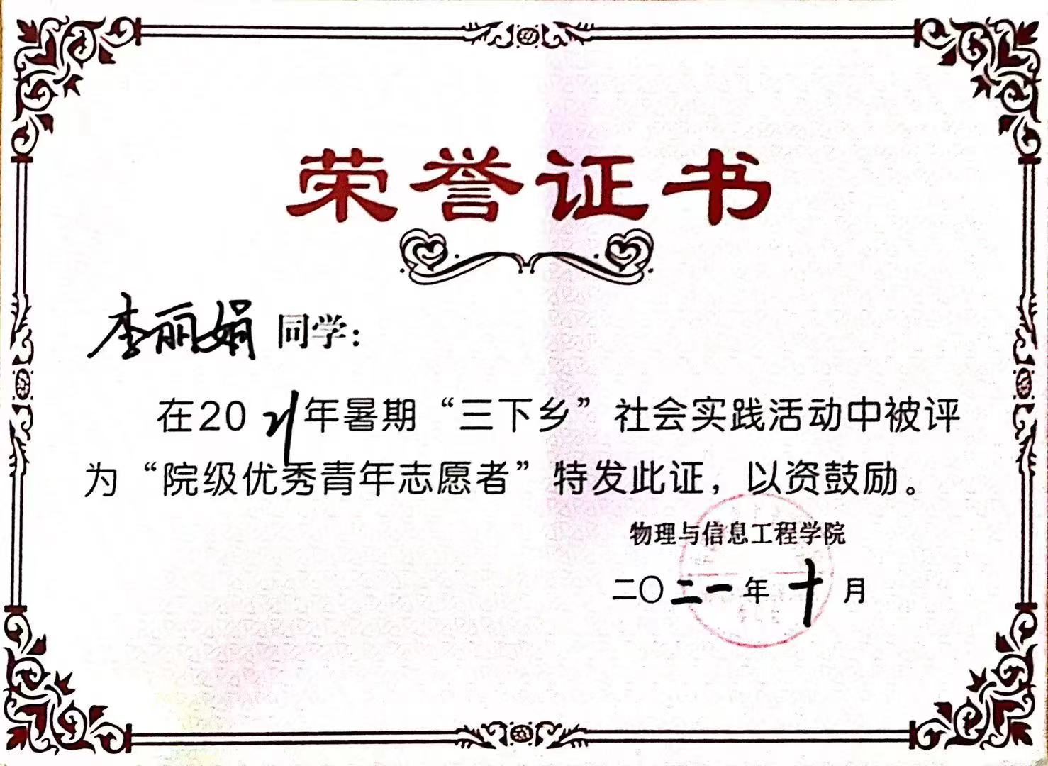 2020-2021学年被评为院级优秀志愿者