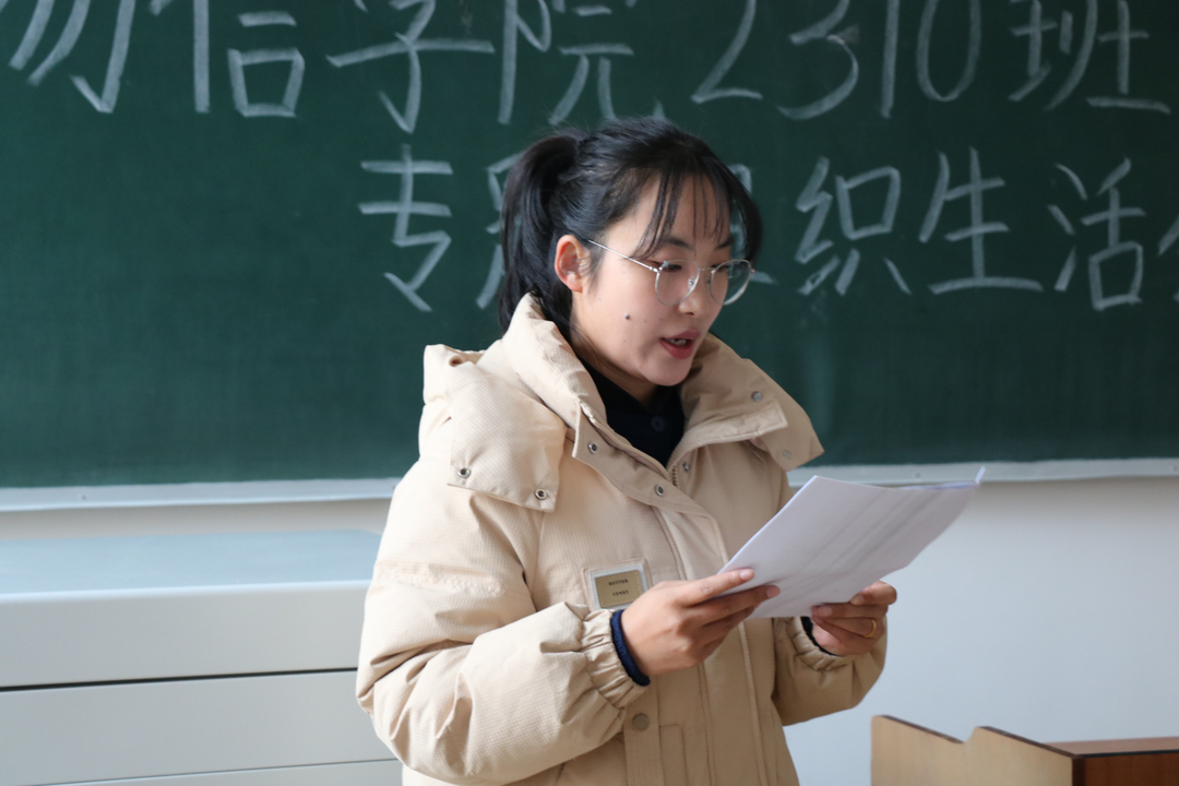 12月29日上午,公司2310班团支部专题组织生活会在南区3206教室召开。院团委副书记马丽娜参加了会议,会议由2310班团支部书记李锦楠主持。