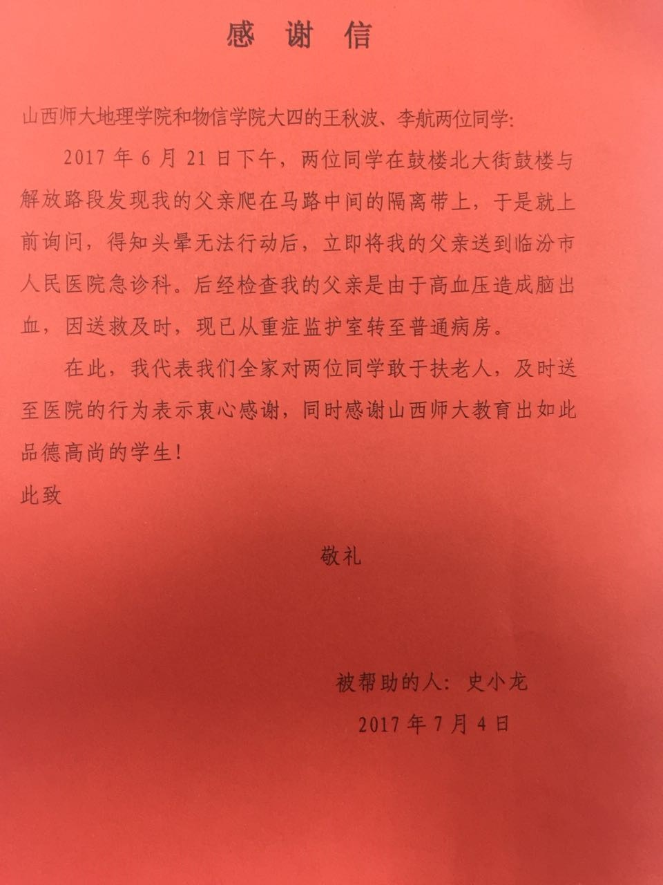 据悉,6月21日下午,临汾市区正在下雨。公司2013级员工李航与地理学院员工王秋波,在鼓楼北大街鼓楼与解放路段发现一位高龄老人爬在马路中间的隔离带上,于是上前询问。当得知老人因头晕而无法行走时,两人立即冒雨将老人送往临汾市人民医院急诊科。经诊断,老人是因患高血压而引发的脑溢血,由于救治及时,老人现已脱离危险,从重症监护室转至普通病房。两位同学“雨中救助病危老人”的先进事迹深深地感动了病人家属,也感动了各大主流媒体。