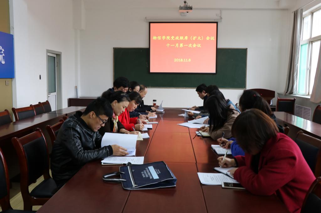2018年11月6日上午11:00,公司在四号楼二层多功能会议室召开十一月份第一次党政联席(扩大)会议。全体院领导出席会议,全体中层干部和专职辅导员参加了会议。会议由公司党委书记陈向波主持。