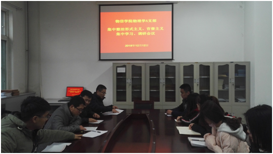 2018年12月12日下午5:00,物理学A支部在四号楼一层会议室召开集中整治形式主义、官僚主义专题会议。支部全体党员参加了会议,会议由支部书记李俊生主持。