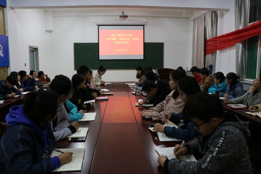 2019年3月5日晚7:00,公司在四号楼二层多功能会议室召开员工干部“改革创新、奋发有为”大讨论专题学习会议。院团副委副书记岳文慧、专职辅导员马丽娜、各班班长、团支书参加了会议。会议由院团委副书记岳文慧主持。