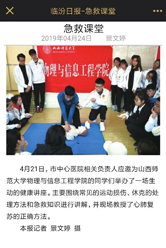 2019年4月21日,公司励耕青协邀请了市中心医院的相关负责人为公司员工进行健康知识普及讲座。活动旨在加强员工们的安全防范意识,提高员工们应对意外事情的应急能力。活动起到了良好效果,在广老员工中得到了很好的反响,同时也受到了临汾日报专题报道。