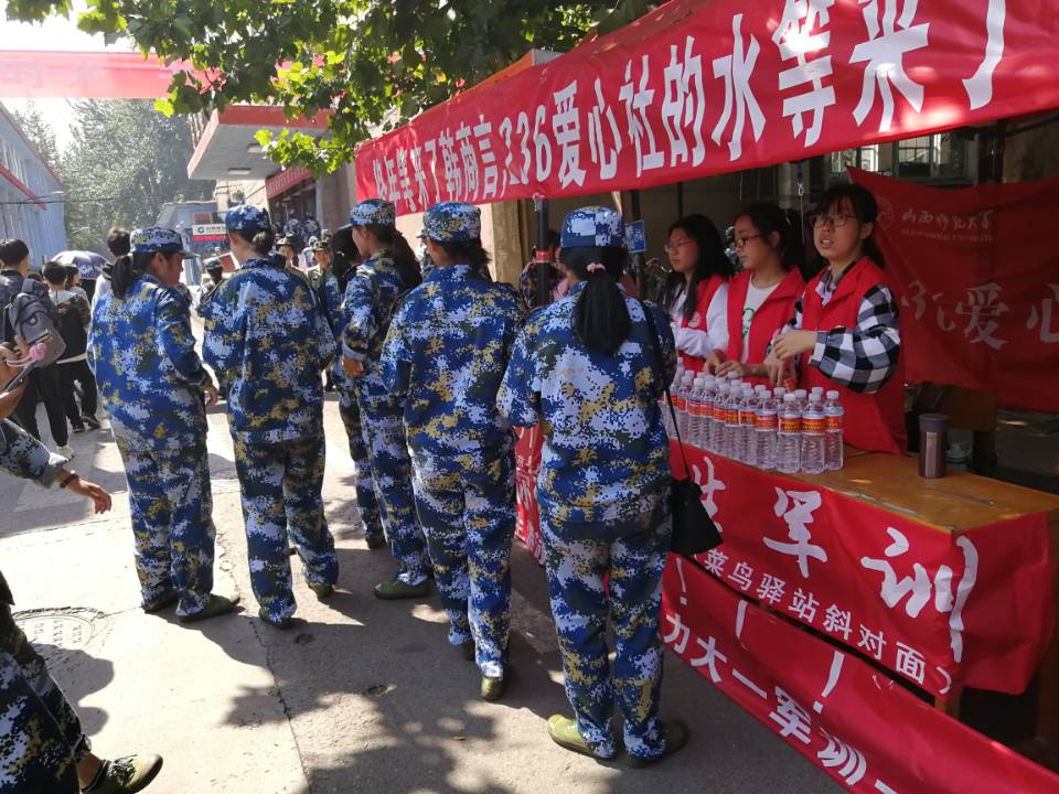 八个同学、六张课桌、一箱箱摆放整齐的矿泉水、一张张热情洋溢的笑脸……军训期间,他们坚持每天为新生提供免费矿泉水轮流值班,热情服务,鲜艳的红色社服,已成了军训期间一道靓丽的风景线,天气很热,军训很累,但心里很暖。
