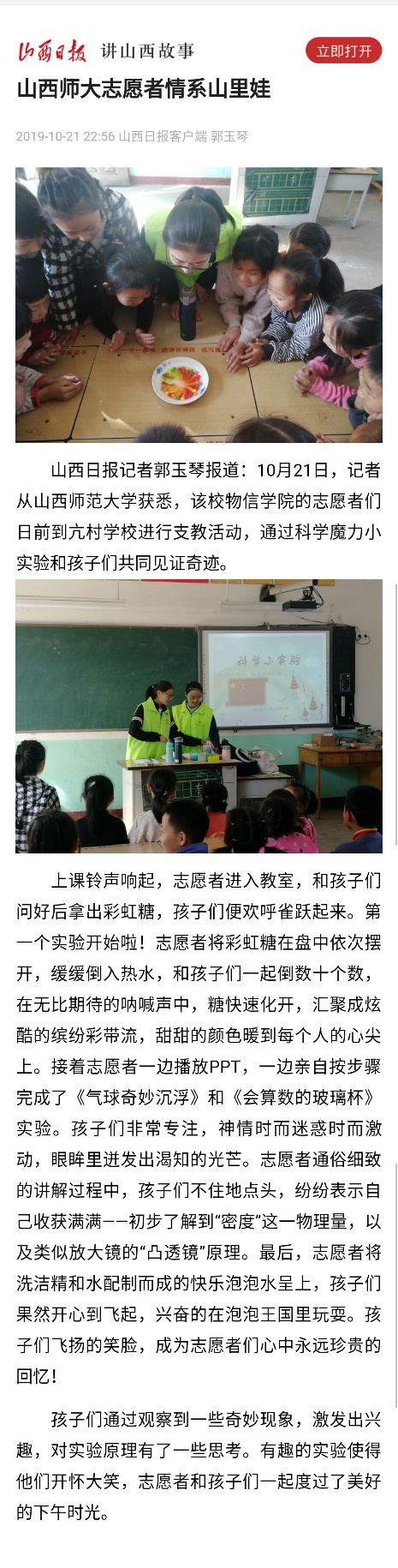 2019年10月20日、21日,山西日报客户端和山西晚报分别以“山西师大志愿者情系山里娃”和“山西师大志愿者走进临汾乡村学校支教”为题,对公司的志愿者们前往临汾市尧都区亢村学校进行的一场科普主题支教活动进行了报道。