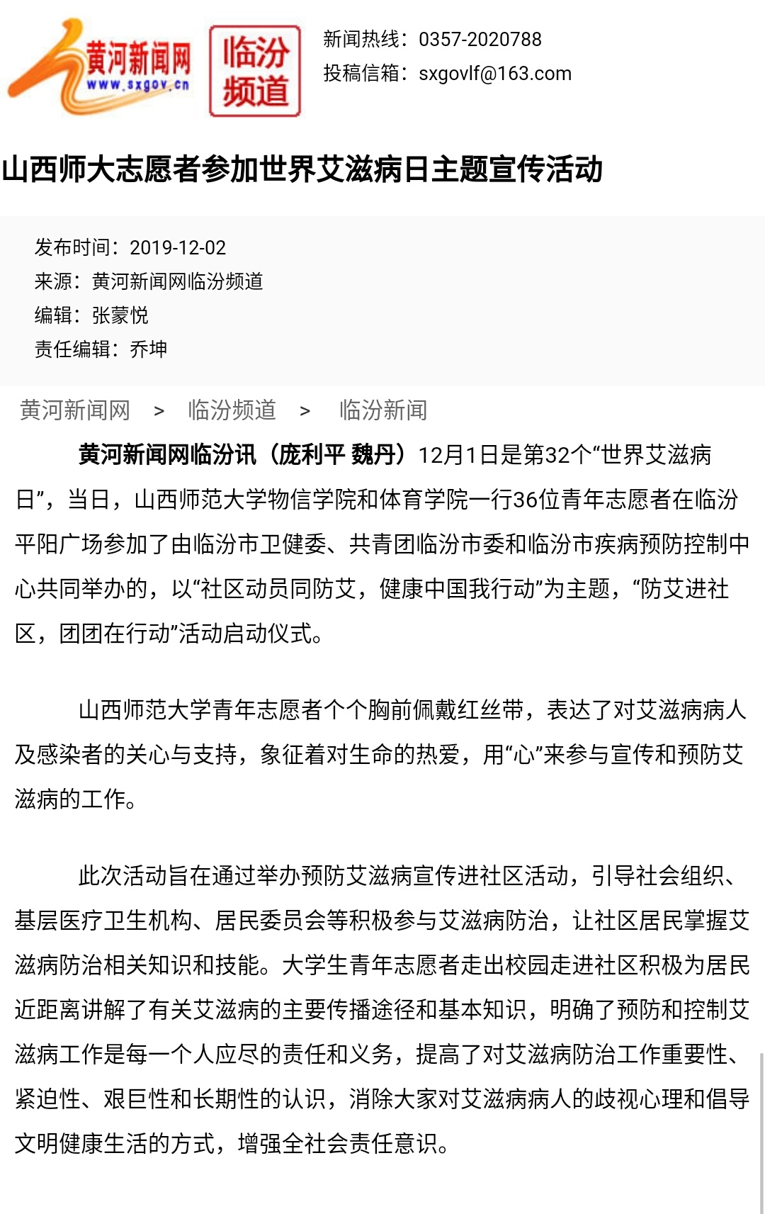 此次活动引起了社会各界人士的关注,公司参加此次活动也被多家媒体报道。 2019年12月1日和12月2日,黄河新闻网、黄河纪实新闻网、聚焦热点公众号均以“山西师大志愿者参加世界艾滋病日主题宣传活动”为题报道了公司青年志愿者于平阳广场参加2019年世界艾滋病日主题宣传活动暨“防艾进社区,团团在行动”活动启动仪式。