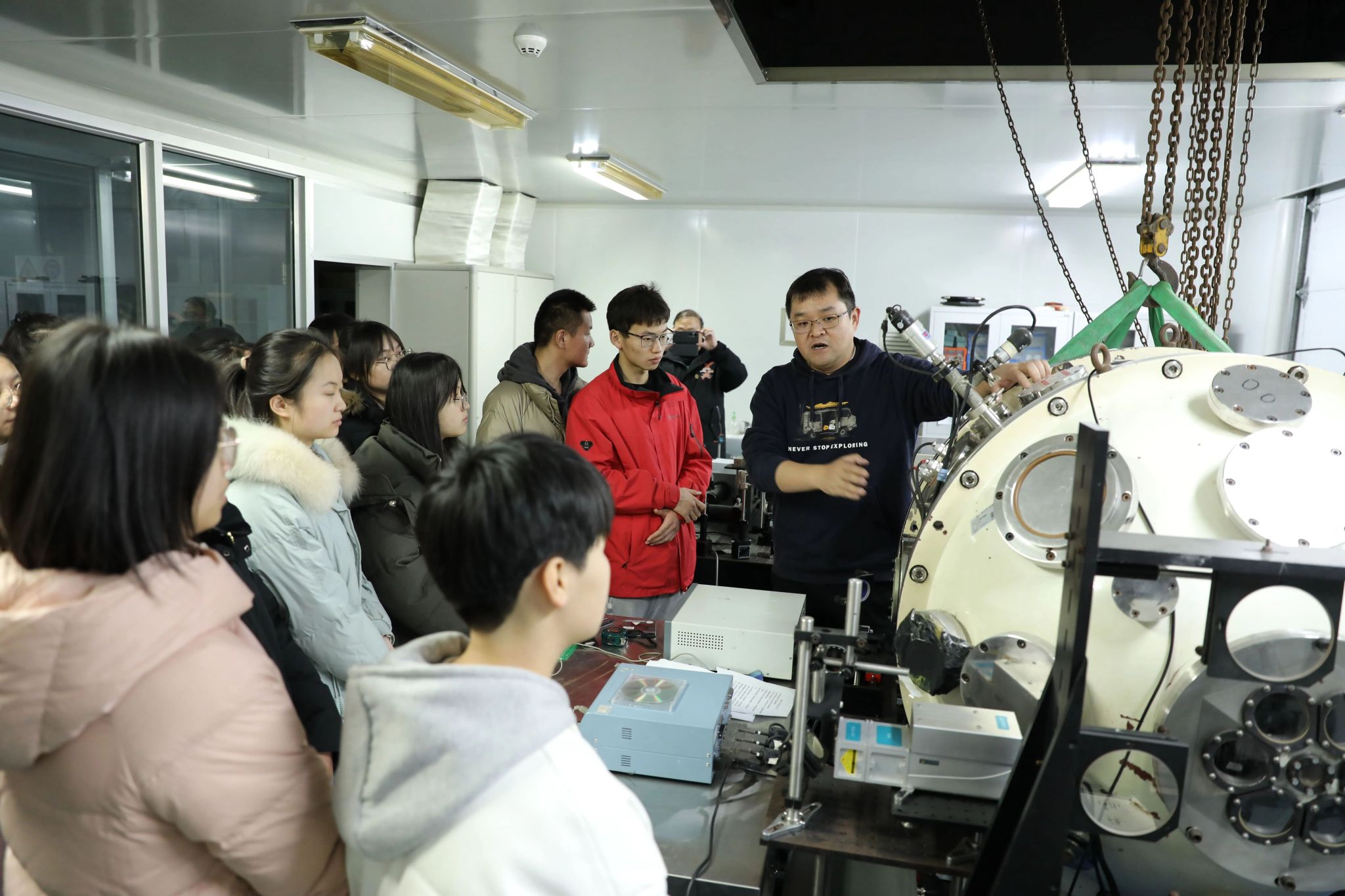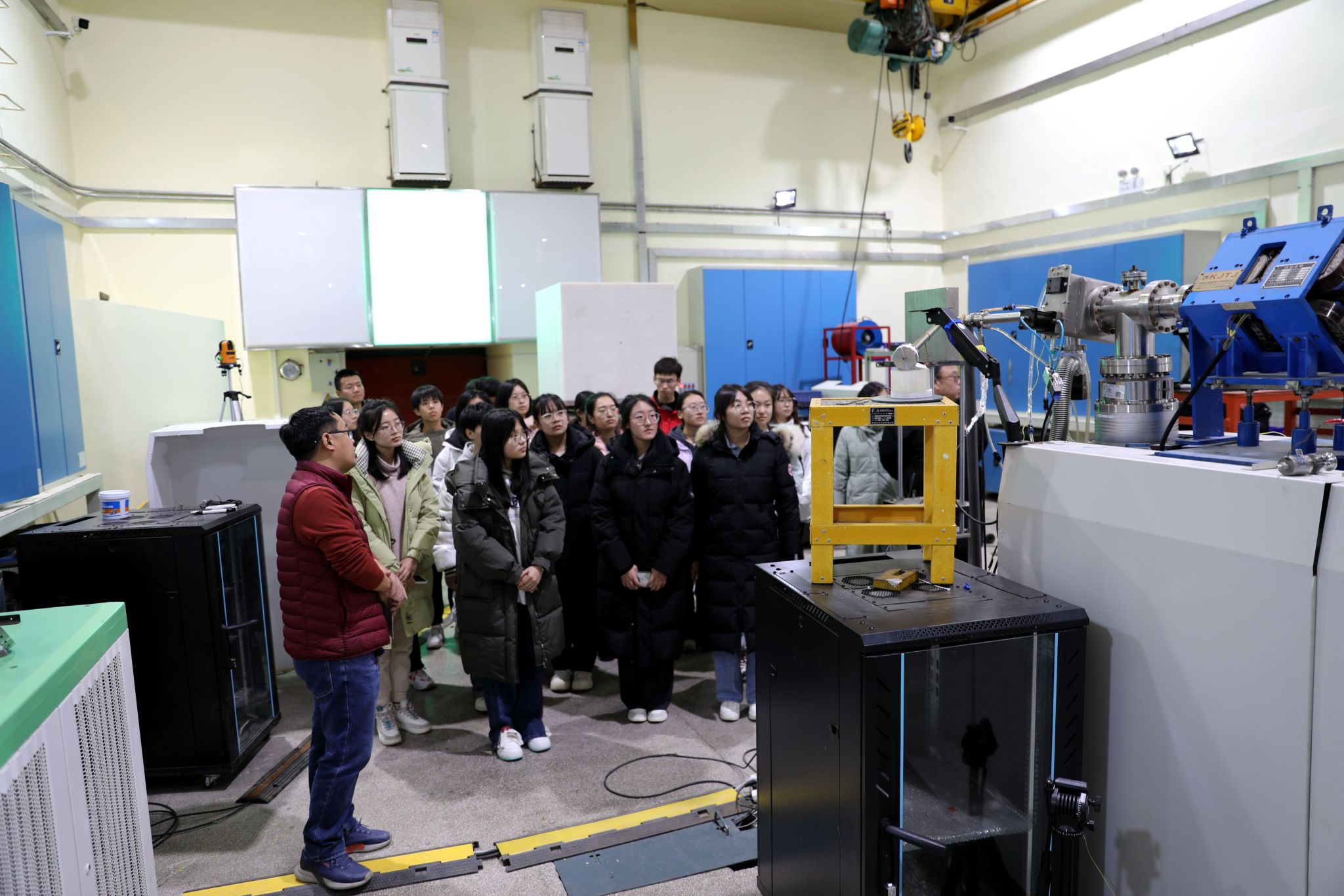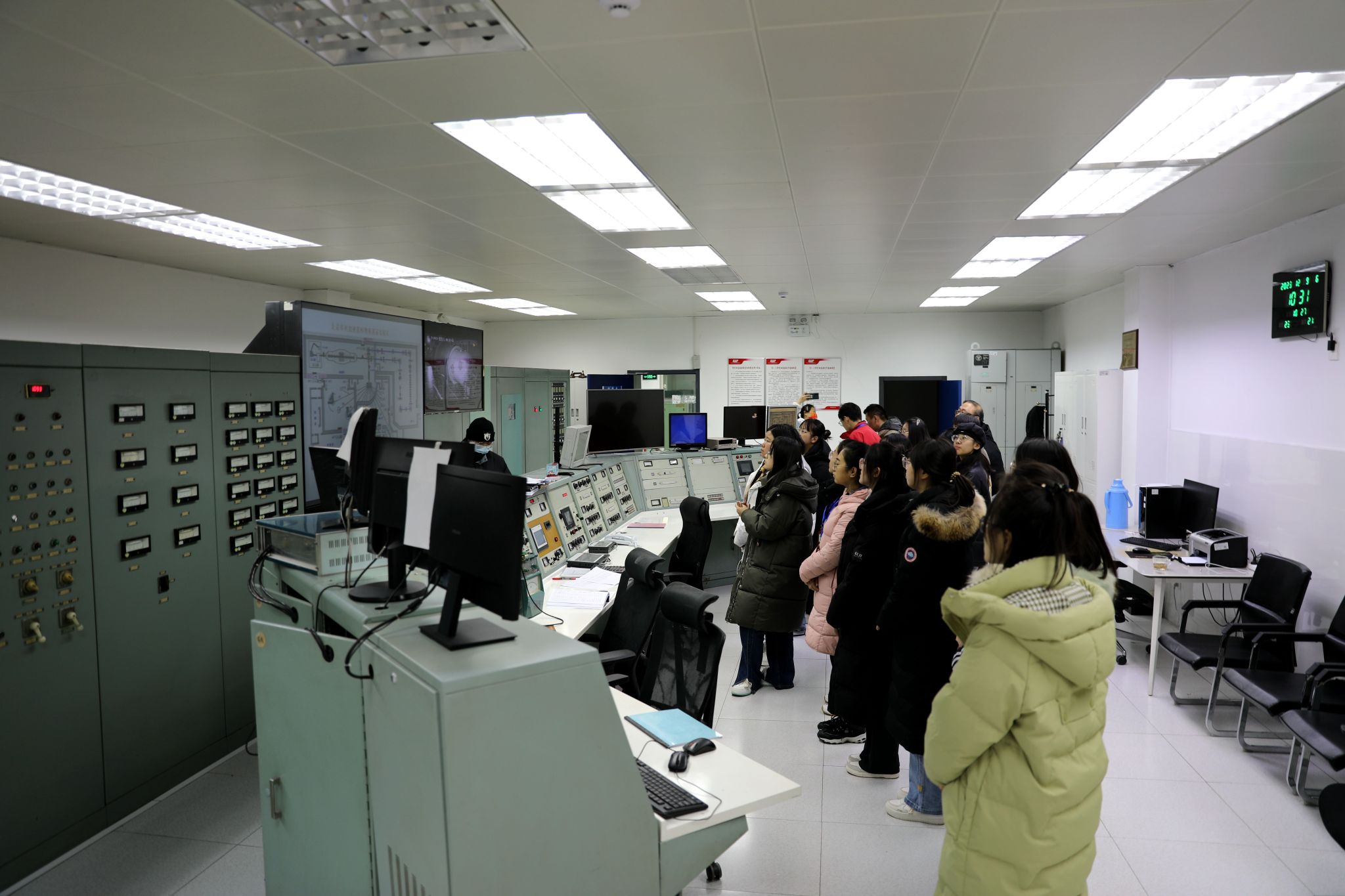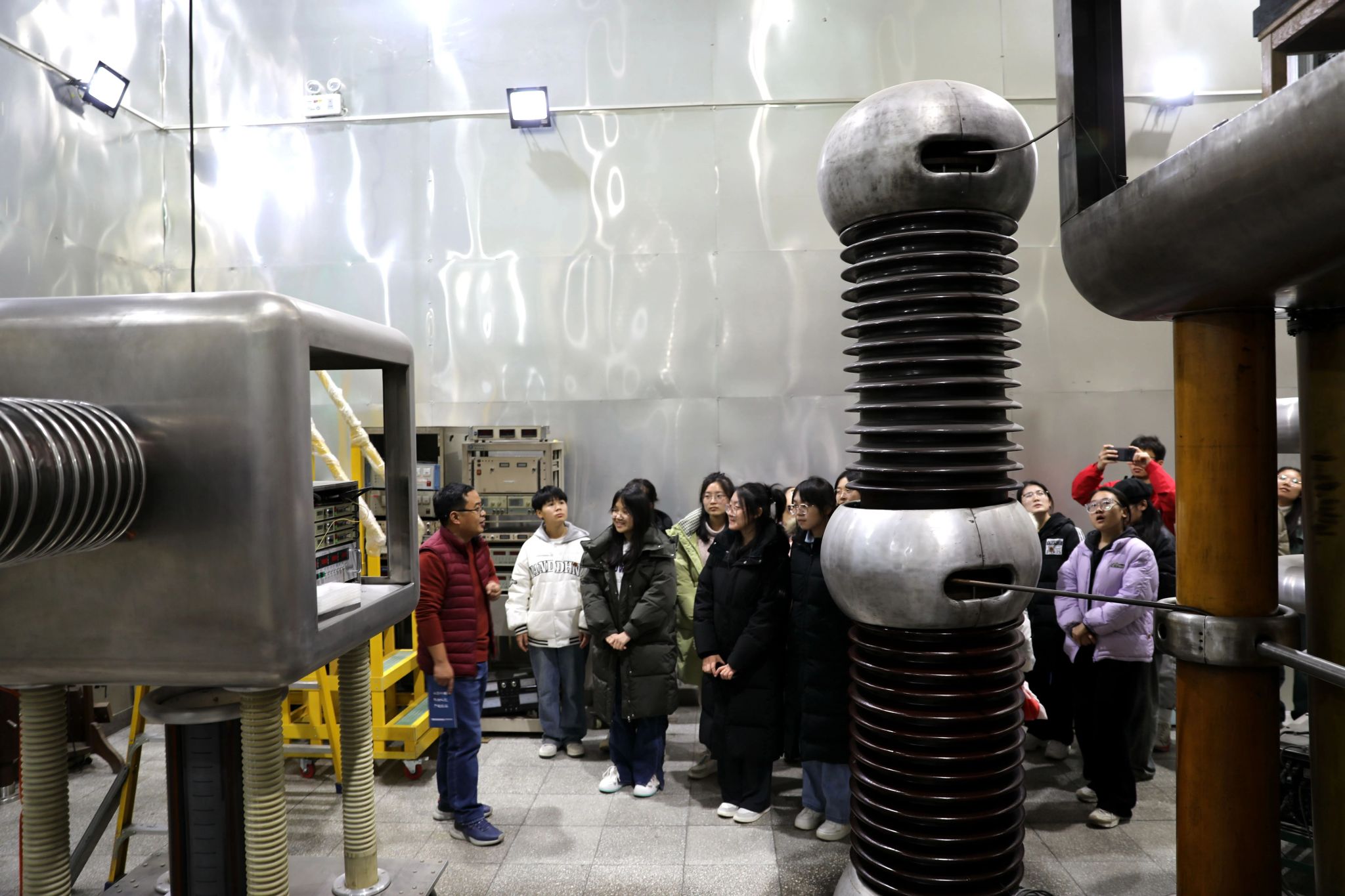 在参观环节,师生首先参观了中国核工业科技馆。在工作人员耐心讲解下,同学们了解了不同历史时期核科学家的故事与中国核工业发展历程,深刻体会一代代核科技工作者强核报国、创新奉献的高尚情操。随后,分别参观了中国实验快堆、串列加速器、超导直线加速器、高压倍加器与“天光一号”装置等,工作人员对这些科学装置的工作原理以及用途进行了详细的介绍。同学们第一次接触这些实验装置,表示深感震撼,并提出了许多关心的问题,工作人员也耐心地进行详细解答。