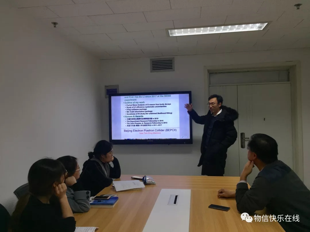 2018年12月25日下午5:00,中国科学院高能所博士后柯百谦应邀来公司综合实验楼506室做了题为“Charmed Meson Hadronic Decays at BESIII”的学术报告。学院粒子物理组教师和研究生聆听了报告。报告会由萧佑国教授主持。