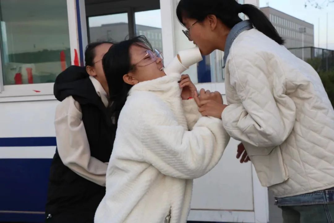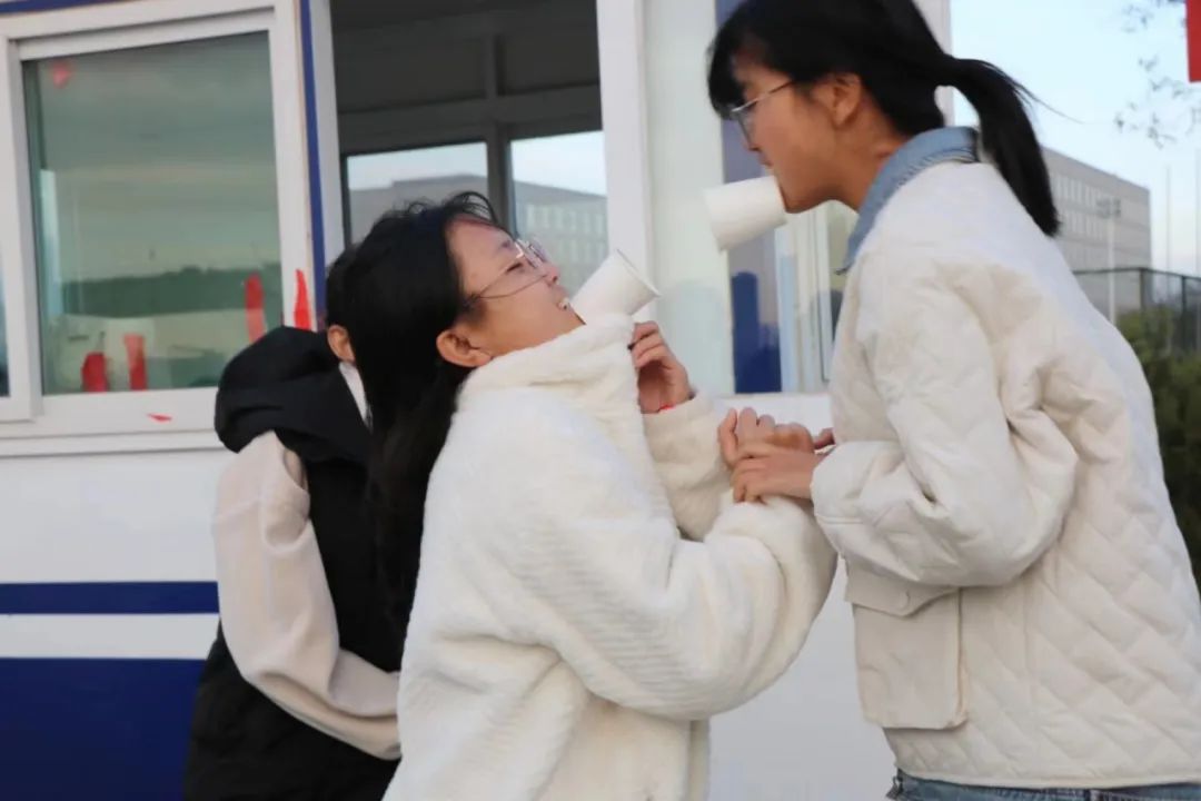 三位同学叼纸杯传球,在保证球中途不掉,成功传递五个乒乓球。同学们共同把握球的运动,凭借身体的扭动和头部的晃动,传球接球,一气呵成。