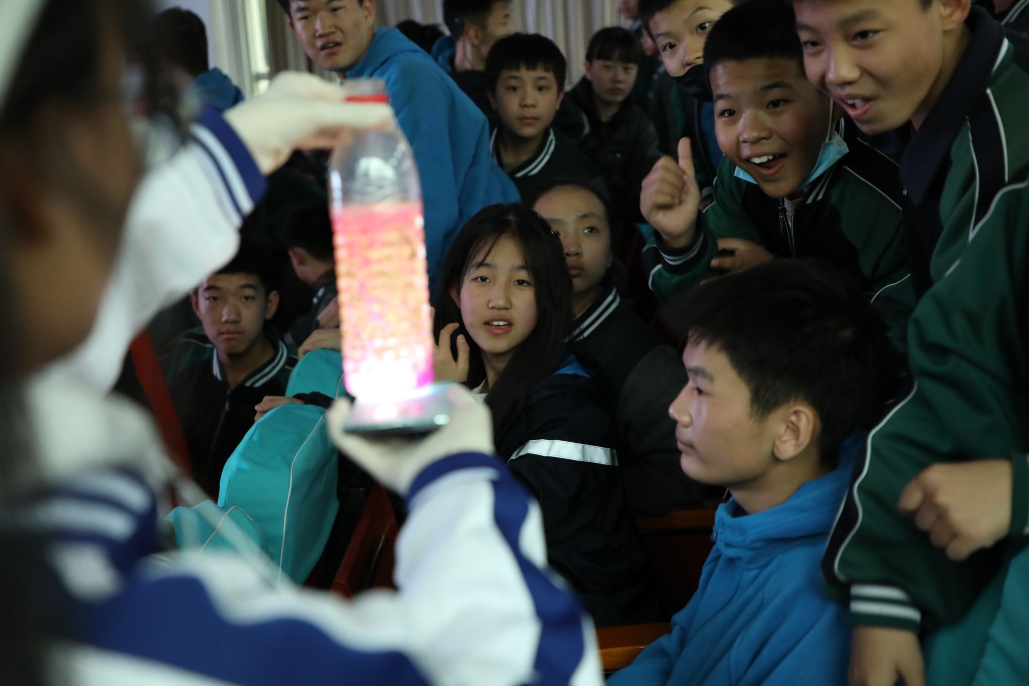活动在精彩绝伦的变脸中拉开帷幕,随着演员一张张面具的揭开,孩子们爆发出阵阵惊叹,现场瞬间变成了欢乐的海洋。紧接着,236爱心社成员和聋校的孩童们分别为彼此送上精心准备的手语舞《一起向未来》和《不忘初心》,大家心相连、爱相通,传递热情与祝福。随后,社员们为聋校师生展示了《蓝瓶实验》《熔炎灯》《烟雾瀑布》《蛇形摆》《空气炮》等异彩纷呈的科普实验。在志愿者专业、细致的科普下,孩子们的脸上流露出对知识的渴望,一系列生动有趣的实验点燃了他们崇尚科学的星星之火,让他们了解到科学离他们不再遥远。之后,志愿者和孩子们又进行了弹乒乓球、心愿智慧树等有趣的游戏。整个活动现场暖意融融、情真意切。听障儿童所展示出的乐观积极、向阳而生的态度深深感染了在场的每一位236爱心社成员。