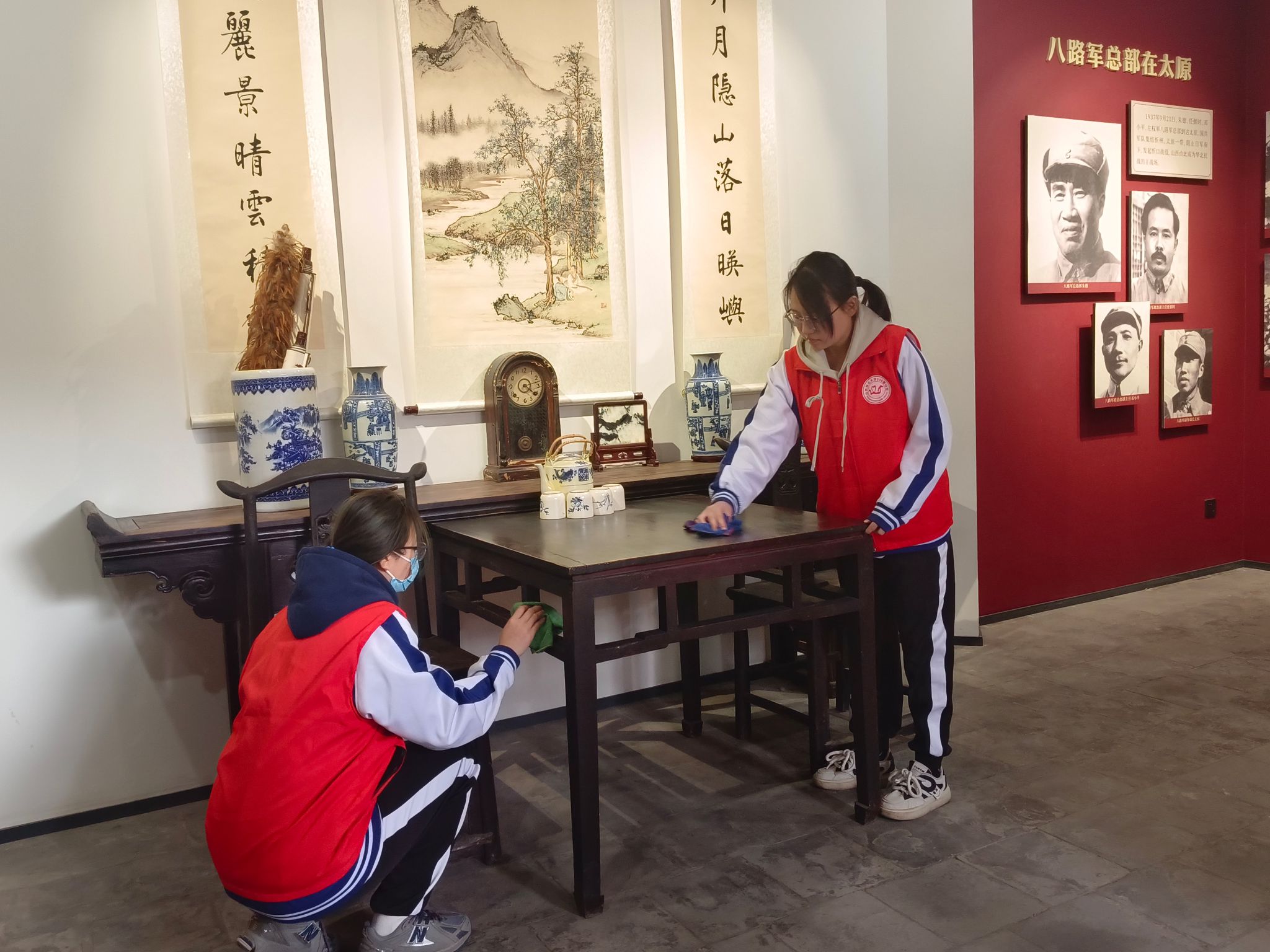 活动过程中,志愿者们分工明确,团结有序。第一组志愿者分别在旧址纪念馆入口、图书馆、会议室及五个展厅内进行了细致的讲解服务。讲解过程中,志愿者们通过调动自身知识储备,让参观者在目睹大量历史文物的同时感受那段艰苦卓绝的岁月中老一辈革命家和青年学子们不屈不挠、勇往直前的精神风貌。第二组志愿者对旧址纪念馆进行了清扫,他们认真清扫地面,擦拭展品,以保持纪念馆的整洁和庄严,让参观者能够更好地了解和感受纪念馆的历史和文化,让这片充满历史底蕴的地方焕发新的光彩。