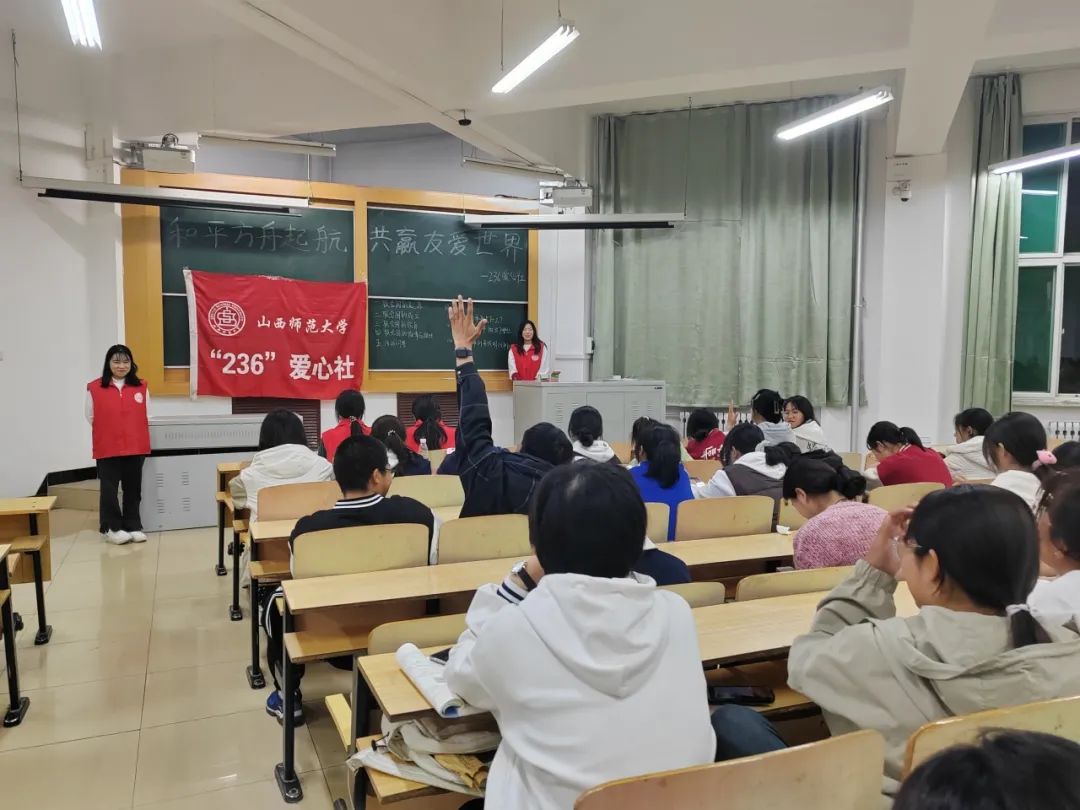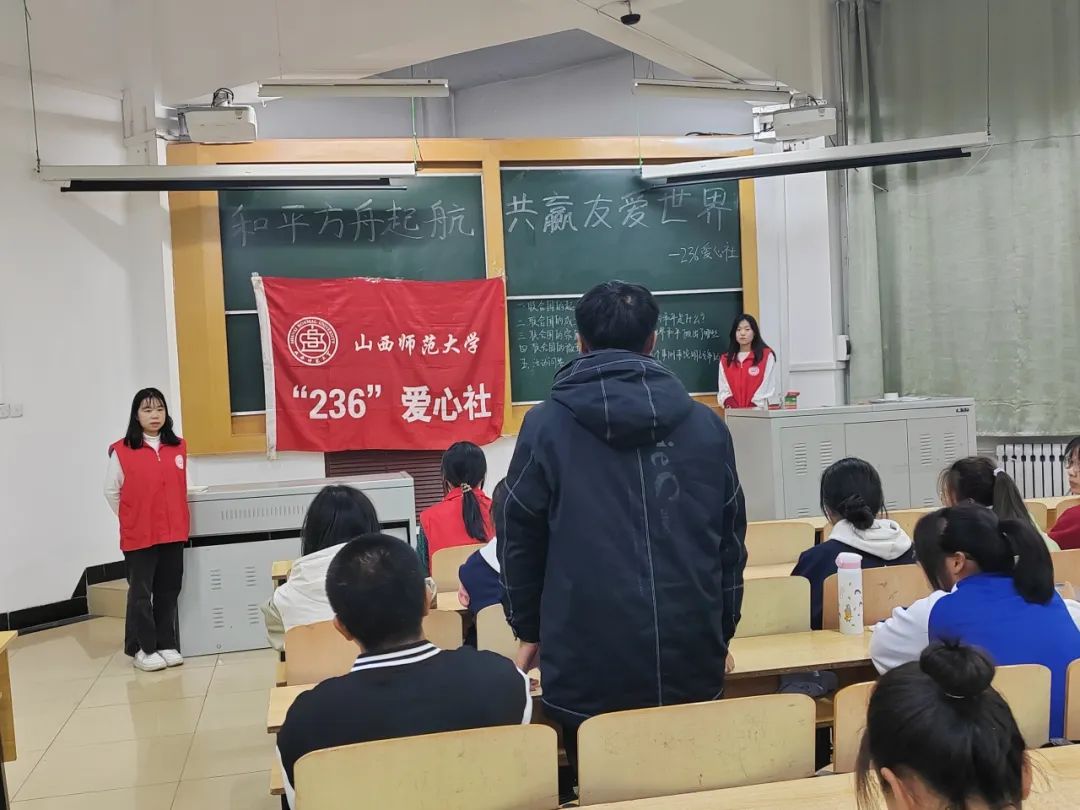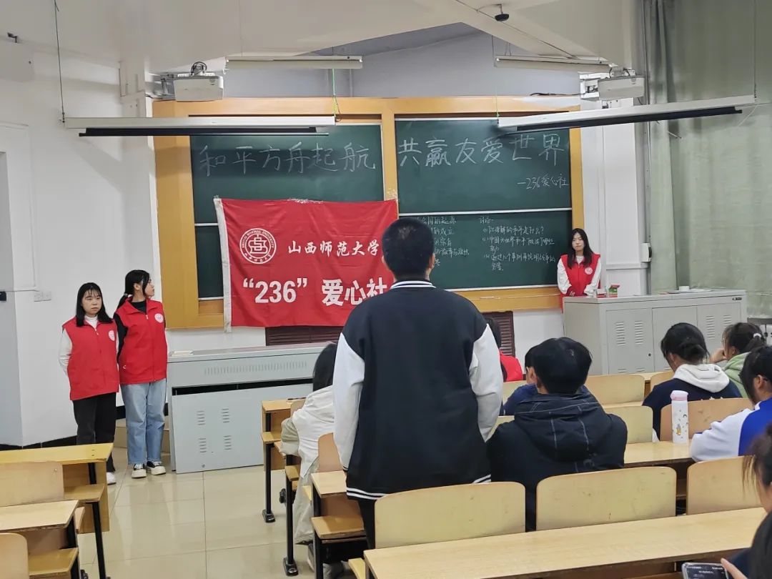 为引导同学们树立珍爱和平的坚定信念,236爱心社于10月24日晚20:30在南区5303教室举办“和平方舟起航,共赢友爱世界”主题活动。本次活动由236爱心社成员王琪主持。