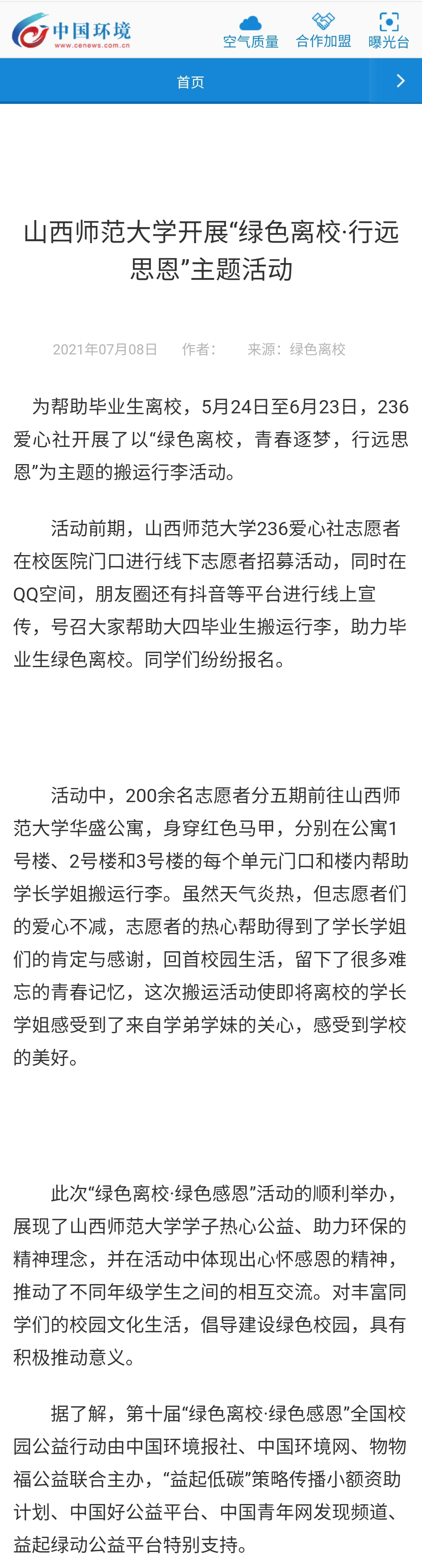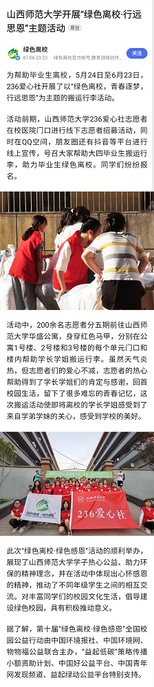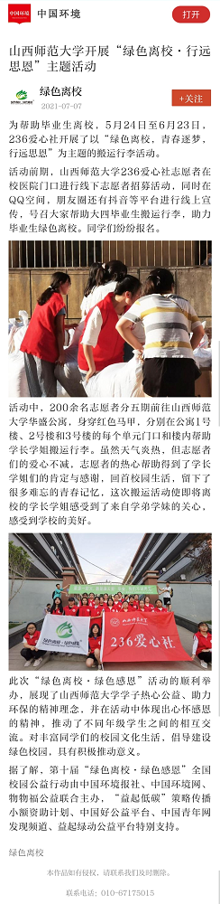 绿色离校官方账号、中国环境客户端、中国环境网分别于7月6日、7月7日、7月8日以“英国365集团公司开展‘绿色离校·行远思恩’主题活动”为题报道了公司236爱心社开展的以“青春逐梦,行远思恩”为主题的搬运行李活动。