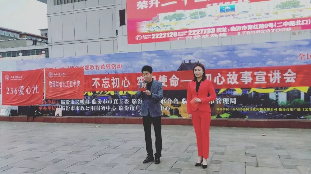2019年11月24日上午9:00,由236爱心社携手习近平新时代中国特色社会主义思想学习社共同主办的以“不忘初心、牢记使命”为主题的宣讲在临汾平阳广场如期举行。
